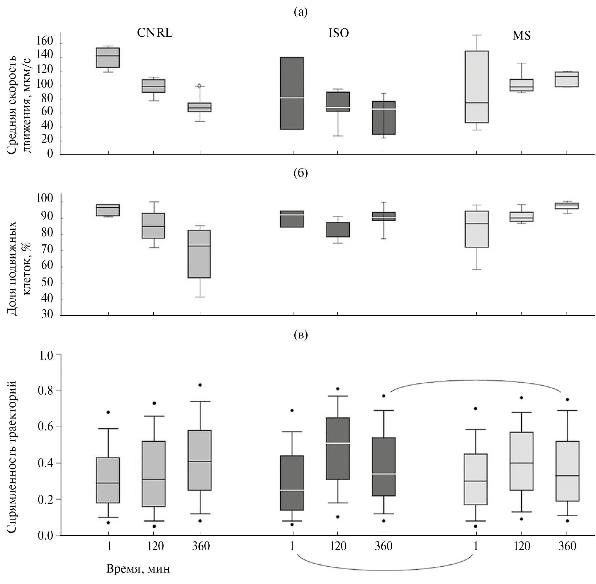 Рис. 6. Средние скорости движения клеток (а), доля подвижных клеток (б) и коэффициент спрямленности траекторий движения (в) динофлагеллят O. marina в экспериментальных сосудах с добавлением I. galbana (ISO), пластиковых микросфер (MS) и в контроле (CNRL) в начале эксперимента, через два и шесть часов. Показаны медианы, процентили 25–75% и 5–95%. Точки обозначают выбросы, дуги соединяют статистически не отличающиеся наборы значений, измеренные в одинаковые минуты эксперимента.