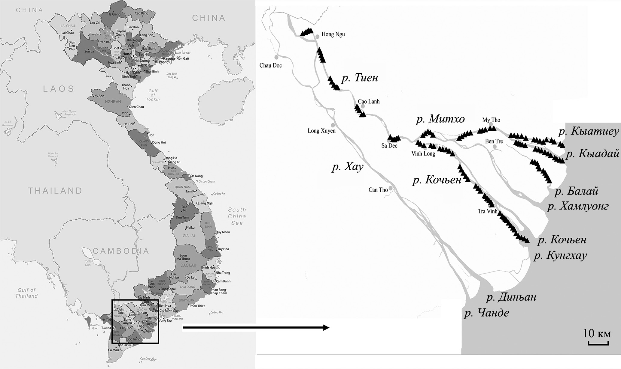 Отбор образцов и проведение биоанализа. Во время экспедиционных исследований с 9 марта по 16 апреля 2022 г. отобраны пробы рыб и ракообразных в провинциях Донгтхап, Виньлонг, Чавинь и Бенче (Вьетнам) (рис. 1). Материал собирали с борта рыбацкого моторного судна при помощи буксируемого промыслового бимтрала с жесткой металлической рамой, ширина которой 4 м, высота 0.4 м, длина тралового мешка 12 м, размер ячеи сетного полотна во всем трале 10 мм.