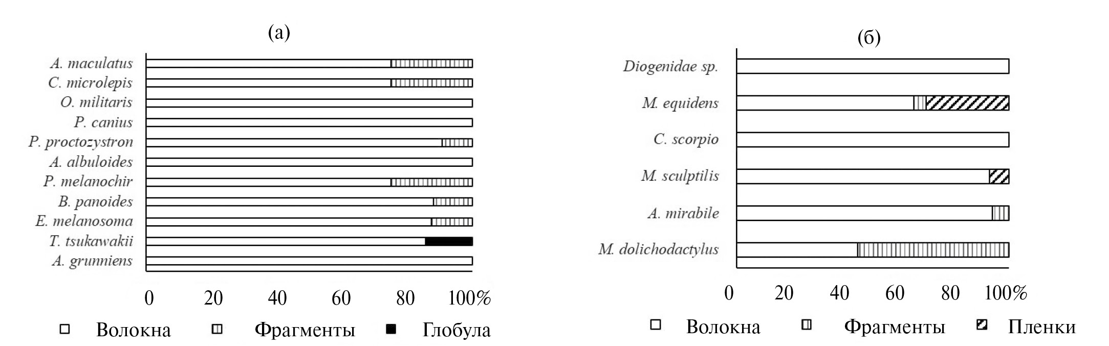 Соотношение типов пластика (волокна, фрагменты и пр.) показано на рис. 2. Установлено, что у рыб волокна статистически значимо доминировали у всех видов (критерий χ2, p <0.05), кроме Cynoglossus microlepis (χ2= 2.00; df = 2; p = 0.37), а у креветок — у всех, кроме Macrobrachium dolichodactylus (χ2 = 4.67; df = 2; p = 0.10).