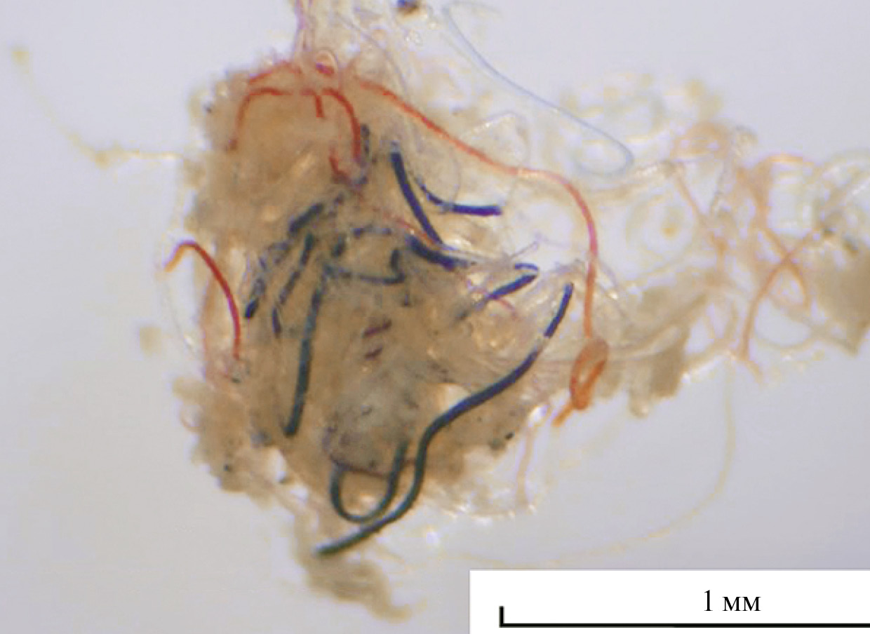 Следует отметить наличие комка волокон размером 1.3 на 1.6 мм в одной из проб с Diogenidae sр. Его основу составляли прозрачные пластиковые волокна разной толщины, и в них были вплетены различные цветные волокна. Точное число прозрачных волокон установить не удалось из-за сложности разделения. Выявлено ≥28 волокон, из них 2 толстых прозрачных волокна и ≥14 тонких. Другие цветные волокна в клубке — красные разной толщины, черные, голубые, оранжевые, темно- и светло-фиолетовые (рис. 3).