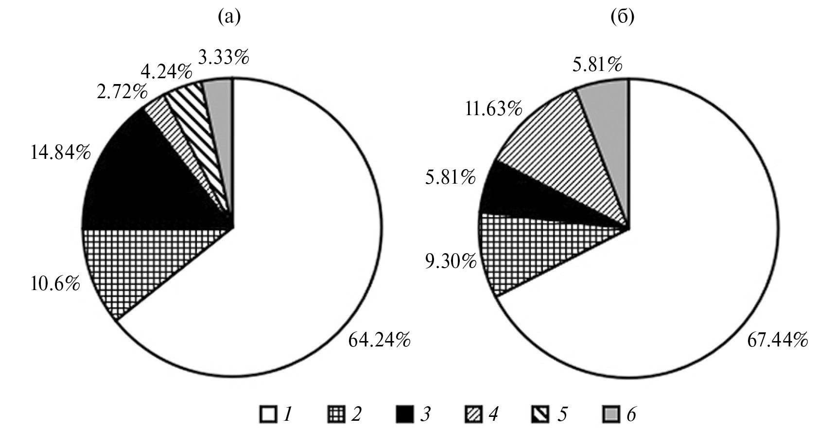 Рис. 4. Процентное соотношение цветов частиц МП в тканях рыб (а) и ракообразных (б). 1 – сине-фиолетовый цвет, 2 – красный, 3 – черный, 4 – зеленый, 5 – желтый, 6 – другой.