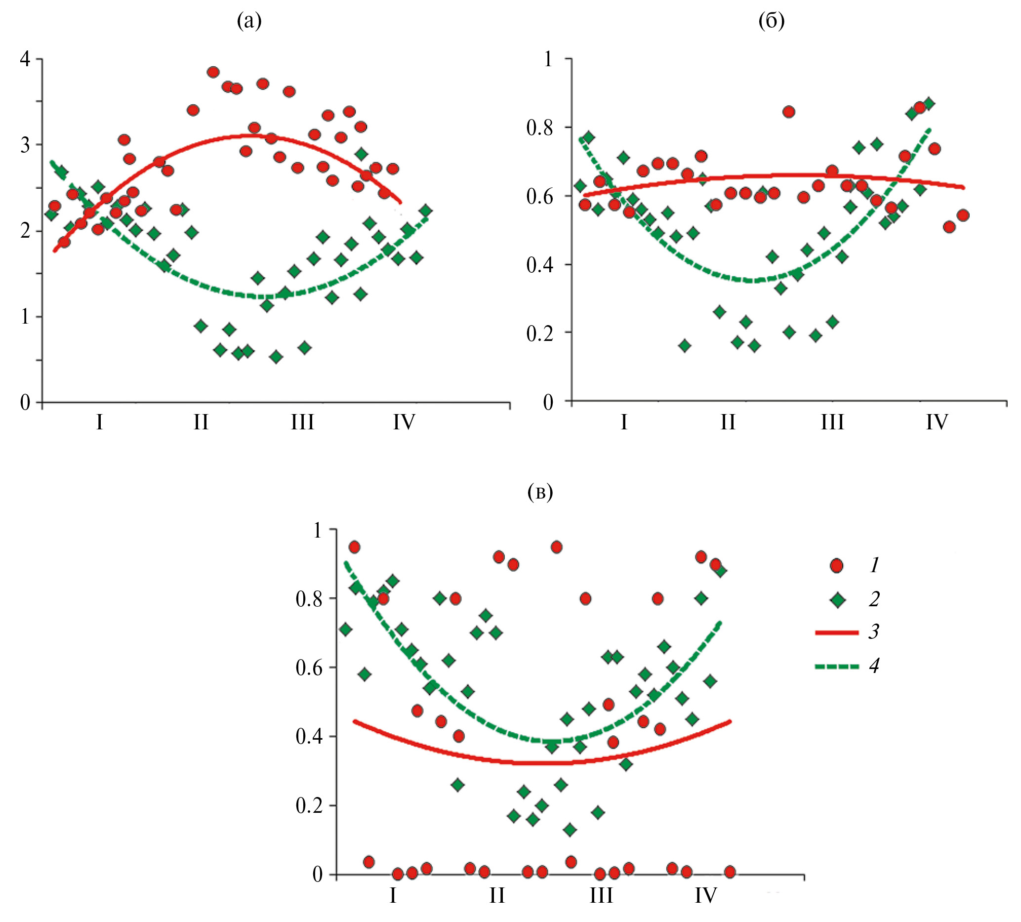 При установлении корреляционных зависимостей между параметрами использовали коэффициент корреляции Пирсона (r). Для проверки достоверности разницы средних значений при анализе количественных данных применяли параметрический метод Стьюдента при уровне значимости р = 0.05. Вклад независимых переменных в вариации зависимых оценивали по коэффициенту детерминации (R2), силу влияния фактора — по критерию Фишера (F). При необходимости ряды данных сглаживали методом осреднения, который отбрасывает случайные вариации. При анализе использовали среднеарифметическое значение x_ и ошибку средней величины Sx_. Материал обрабатывали при помощи пакета прикладных программ для анализа данных MS Excel, XLStat.