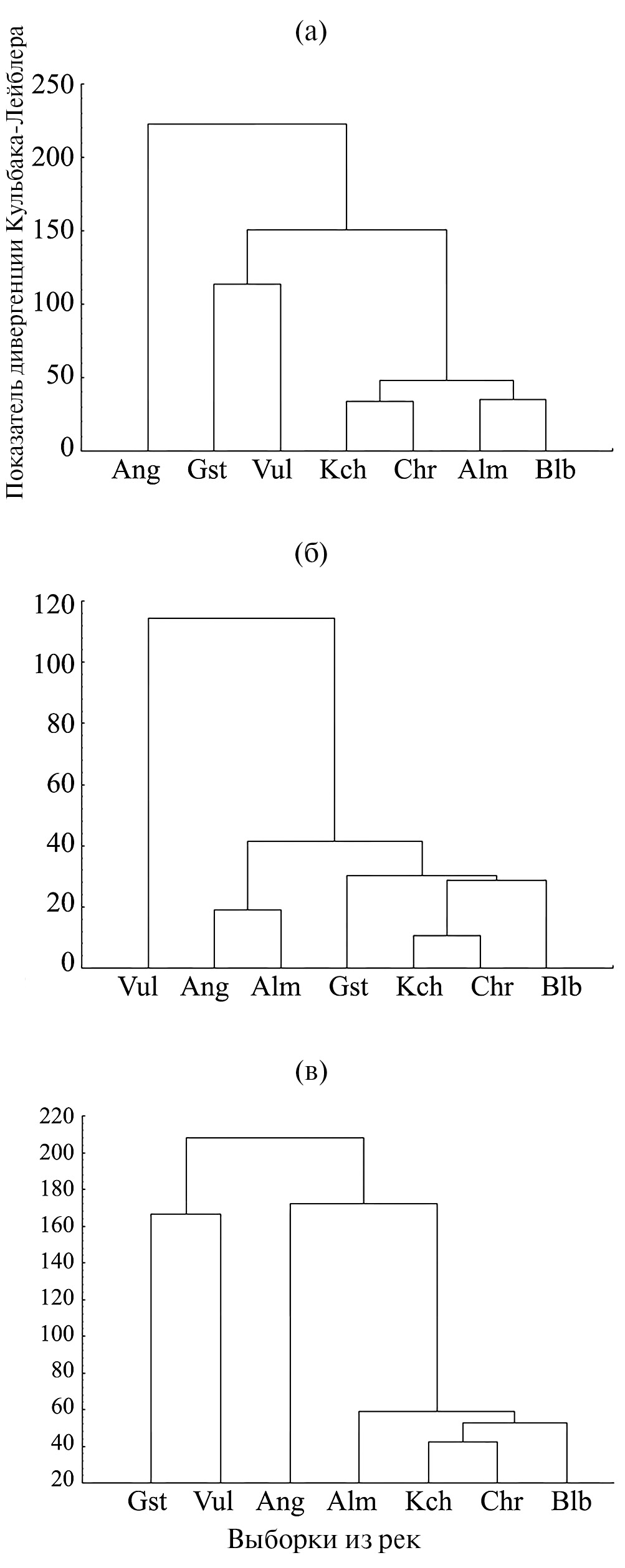 Степень сходства быстрянок из семи рек юга России по изученным признакам представлена на дендрограммах (рис. 2а–2в), построенных с помощью кластерного анализа по показателям дивергенции Кульбака-Лейблера (D) в разных вариантах объединения признаков. Так, при анализе пластических признаков быстрянок (рис. 2а) на низшем уровне дивергенции (D = 30) образуются две независимые группы рыб из рек северного макросклона Крымских гор — Кача и Черная, а также Альма и Бельбек, которые объединяются в кластер на уровне дивергенции ~50. Отдельную группу образуют рыбы из рек Краснодарского края (Вулан и Гостагайка) на уровне дивергенции 110. К образовавшимся группам примыкает выборка из р. Ангара (северо-восточный макросклон Крымских гор).