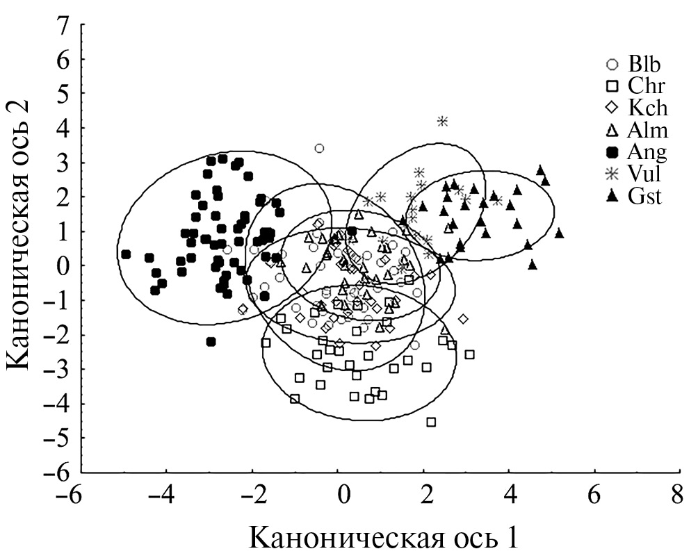 Результаты дискриминантного анализа показали разделение выборок по комплексу пластических признаков. Получено от 88 до 99% статистически достоверных при p ≤0.05 классификаций особей по районам вылова. Исследуемые признаки в выборках образуют облака точек в пространстве двух канонических осей (рис. 3). Согласно имеющимся данным, представители рода Alburnoides из рек Крыма и Краснодарского края по первой оси дифференцированы минимум на три группы. Первую образуют рыбы из р. Ангара, вторую — из рек западной части северного макросклона Крымских гор, к третьей группе можно отнести рыб из рек Краснодарского края, в то же время, по р. Вулан идет перекрытие с группой из крымских рек. По второй оси от остальных группировок слабо отделяется выборка из р. Черная.