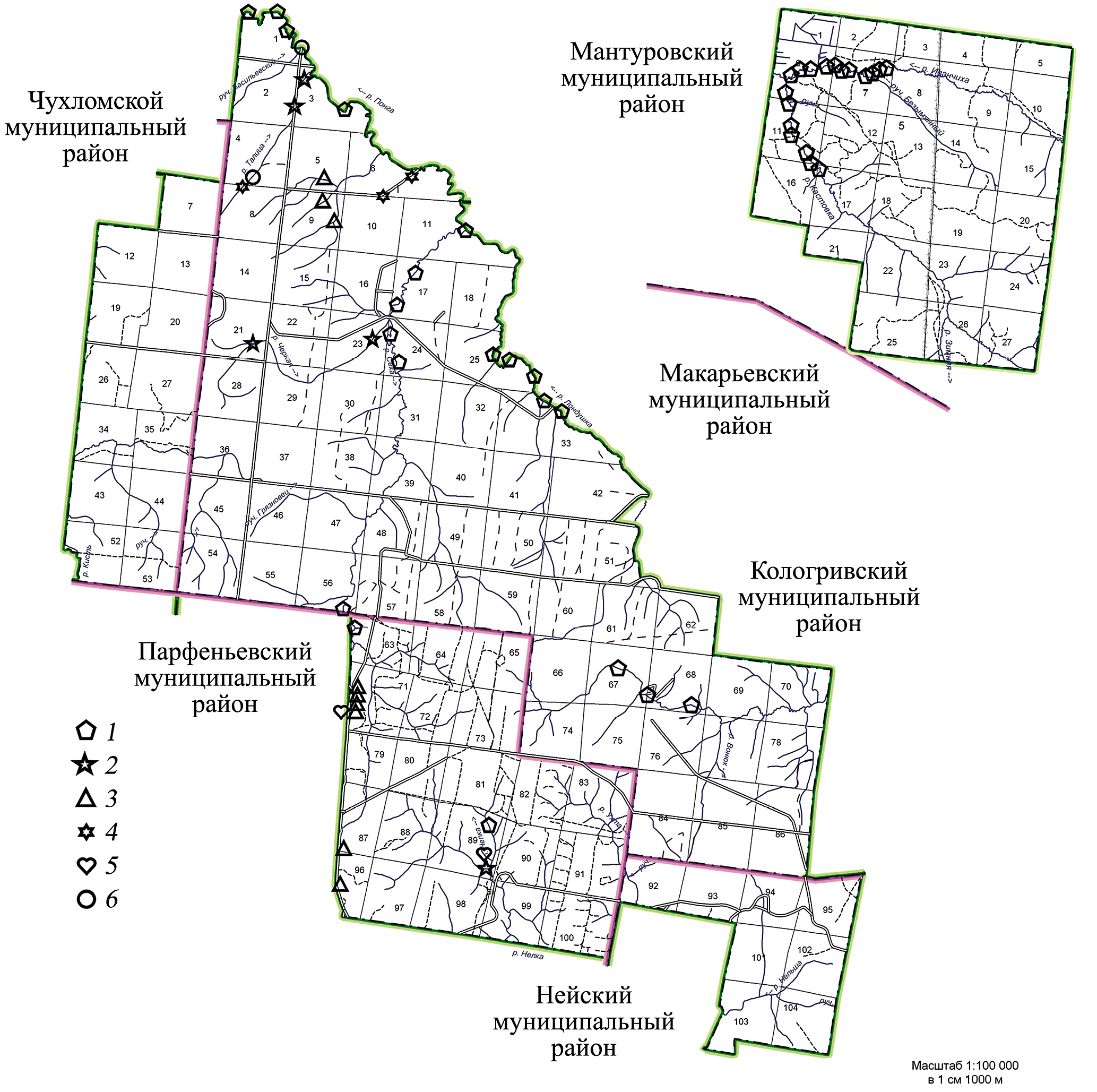 Рис. 1 Основные станции отбора проб зоопланктона на территории Кологривского кластера заповедника. 1 – бобровые пруды на участках рек с высокой поймой, 2 – бобровые пруды на участках с низкой поймой, 3 – многолетние бобровые пруды на ручьях, 4 – нижние бобровые пруды, 5 – новые бобровые пруды, 6 – повторное поселение.