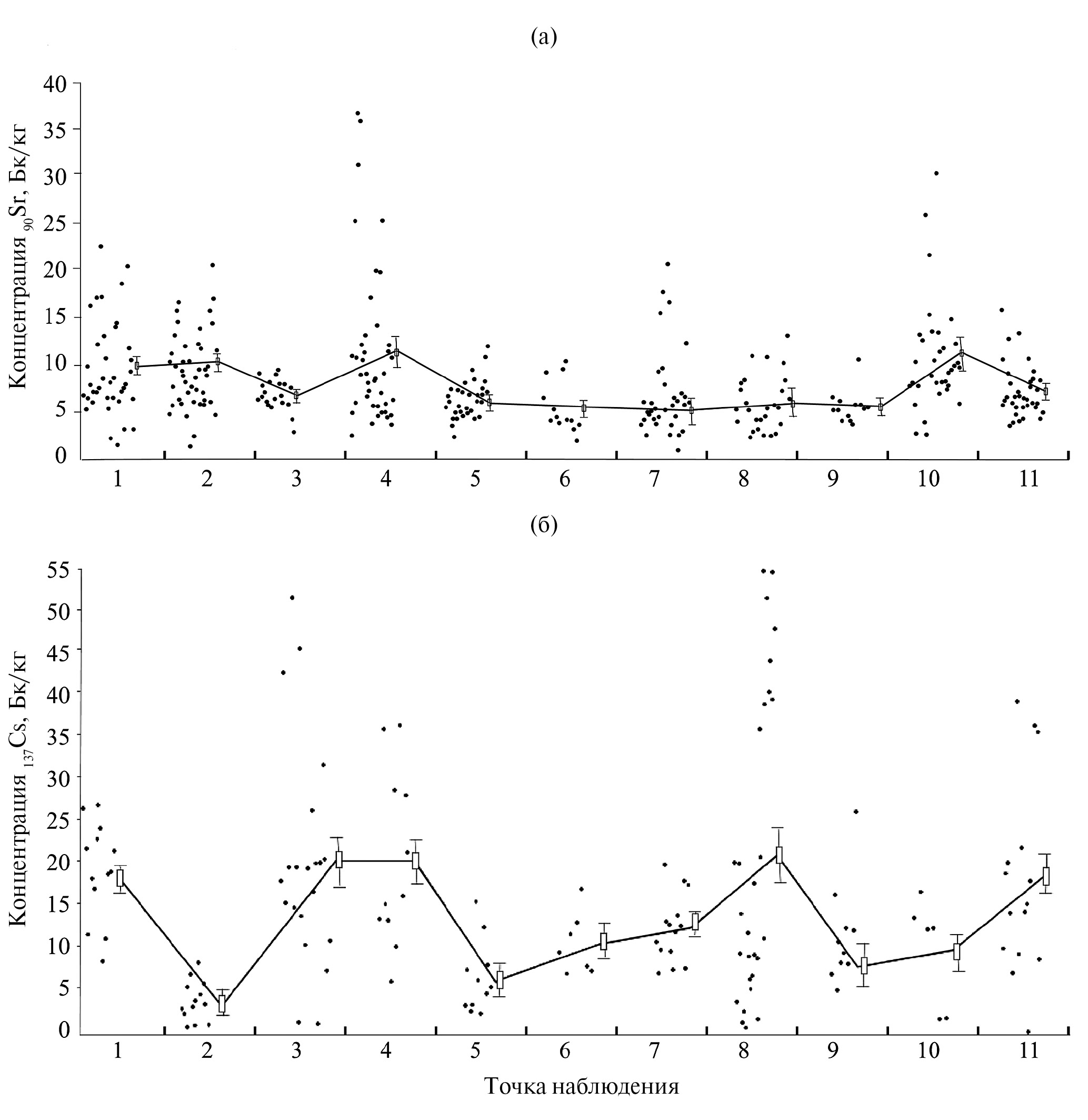 Выявлены индивидуальные и средние значения концентраций радионуклидов в лягушках, отобранных на исследуемых территориях Среднего Урала (рис. 2). Средние уровни концентраций 90Sr в лягушках различных местообитаний близки между собой (5.6–11.5 Бк/кг сухой массы), тогда как индивидуальные показатели в некоторых водоемах характеризуются заметной вариабельностью. К последним относятся, в основном, крупные водоемы − прибрежная часть Рефтинского водохранилища около ГРЭС (точка 4), побережье Верхнетагильского водохранилища вблизи ТЭЦ (точка 7), береговая часть Верх-Нейвинского водохранилища в районе железнодорожного вокзала (точка 10), примыкающий к Белоярской АЭС район Белоярского водохранилища (точки 1 и 2). Коэффициенты вариации концентраций 90Sr в лягушках для указанных точек наблюдений находятся в пределах 60−75%. Содержание радионуклида в лягушках, обитающих в мелких водоемах и каналах, как правило, более однородно, а коэффициенты вариации характеризуются более низкими значениями (24−32%).