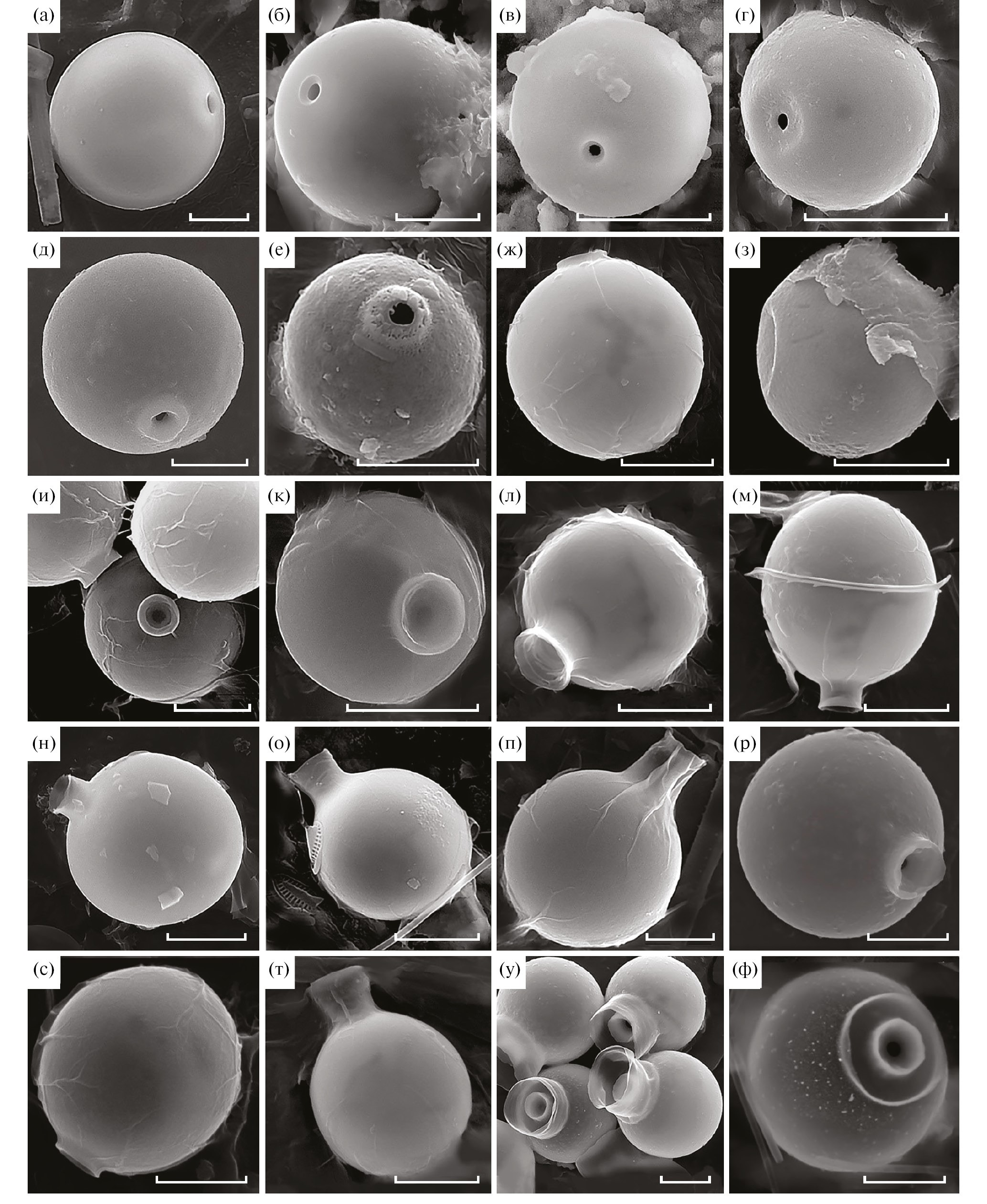 Рис. 2. Неорнаментированные стоматоцисты: а – стоматоциста 1 Duff et Smol emend. Zeeb et Smol; б – стоматоциста 150 Zeeb et Smol; в – стоматоциста 120 Duff et Smol emend Zeeb et Smol; г, з – стоматоциста 11 Pang et Wang; д – стоматоциста 42 Pang et Wang; е – стоматоциста 115 Pang et Wang; ж, и – стоматоциста 127 Duff et Smol; к – стоматоциста 152 Zeeb et Smol; л – стоматоциста 79 Duff et Smol; н, п – стоматоциста 161 Zeeb et Smol; м, с – стоматоциста 116 Zeeb et Smol emend. Brown et Smol формы “А” (с), “В” (м); р – стоматоциста cf. 308 Brown et Smolin; о, т – стоматоциста 120 Pang et Wang; у, ф – стоматоциста 204 Duff et Smol. Масштабная линейка – 5 мкм.