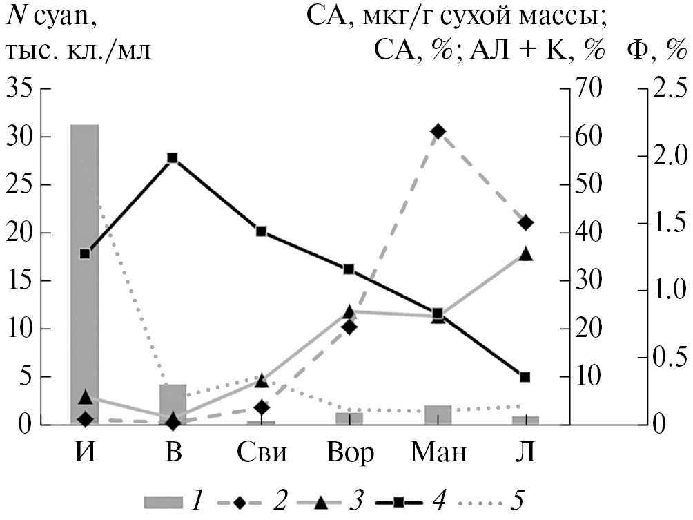 Рис. 3. Изменение численности цианобактерий (Ncyan, тыс. кл./мл) (1), концентрации (СА, мкг/г сухой массы (2) и доли СА, % (3) суммарной доли альдегидов и кетонов, АЛ + К, % (4) и доли фенолов Ф, % (5) в составе P. perfoliatus.