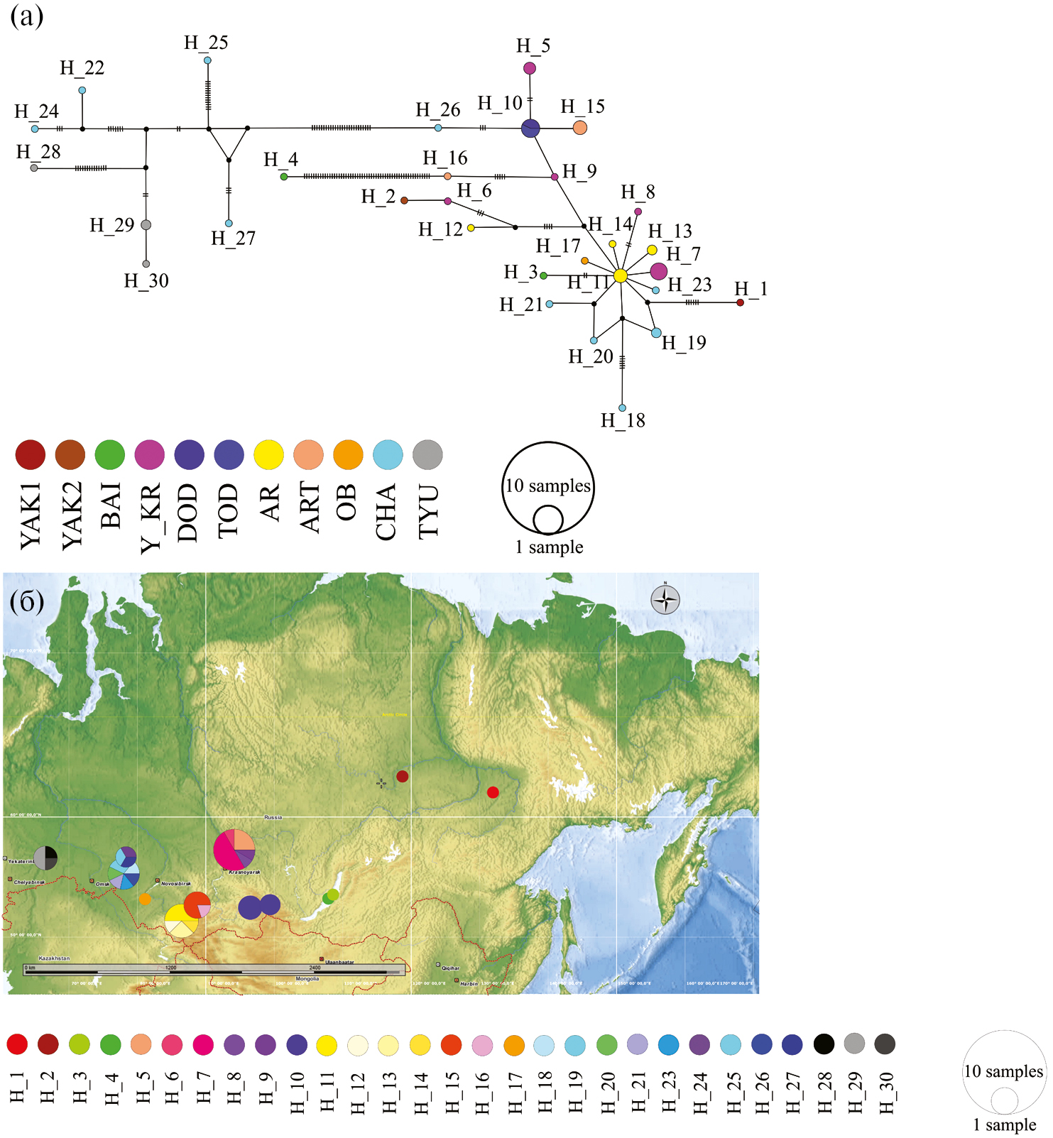 Географическое распределение и сети гаплотипов D. longispina s.str. Все гаплотипы по локусу 12S для D. longispina s.str. группируются в две крупные митохондриальные клады: “сибирскую” “А” и “европейскую” “Б”. Клады связаны через семь мутаций и два гипотетических гаплотипа (рис. 4а). К последним наиболее близки гаплотипы H_7 (горные озера Республики Алтай), H_42 (Ямало-Ненецкий автономный округ) клады “A” и H_38 (бассейн оз. Чаны) клады “Б”. Между кладами расположены гаплотипы из оз. Око Земли (бассейн оз. Байкал), формирующие специфическую митохондриальную группу гаплотипов. Отметим, что 12S гаплотипы “сибирской” клады D. longispina s.str. преимущественно встречаются в водоемах, расположенных восточнее оз. Чаны (бассейн р. Оби) и формируют звездообразную структуру с центральным гаплотипом H_1 (рис. 4a). Этот гаплотип встречается в большинстве популяций, обитающих на территории Северной Евразии – от Ямало-Ненецкого автономного округа до Якутии, однако не зарегистрирован в популяциях из Монголии, Тувы, озер Телецкоe и Додот (рис. 4б). Высокое число уникальных 12S гаплотипов D. longispina s.str. выявлено в бессточных водоемах центральной части Красноярского края (рис. 4б, H_14-H_21). Уникальные гаплотипы обнаружены почти во всех популяциях и связаны с центральным гаплотипом через одну–две, или через три–четыре мутации.