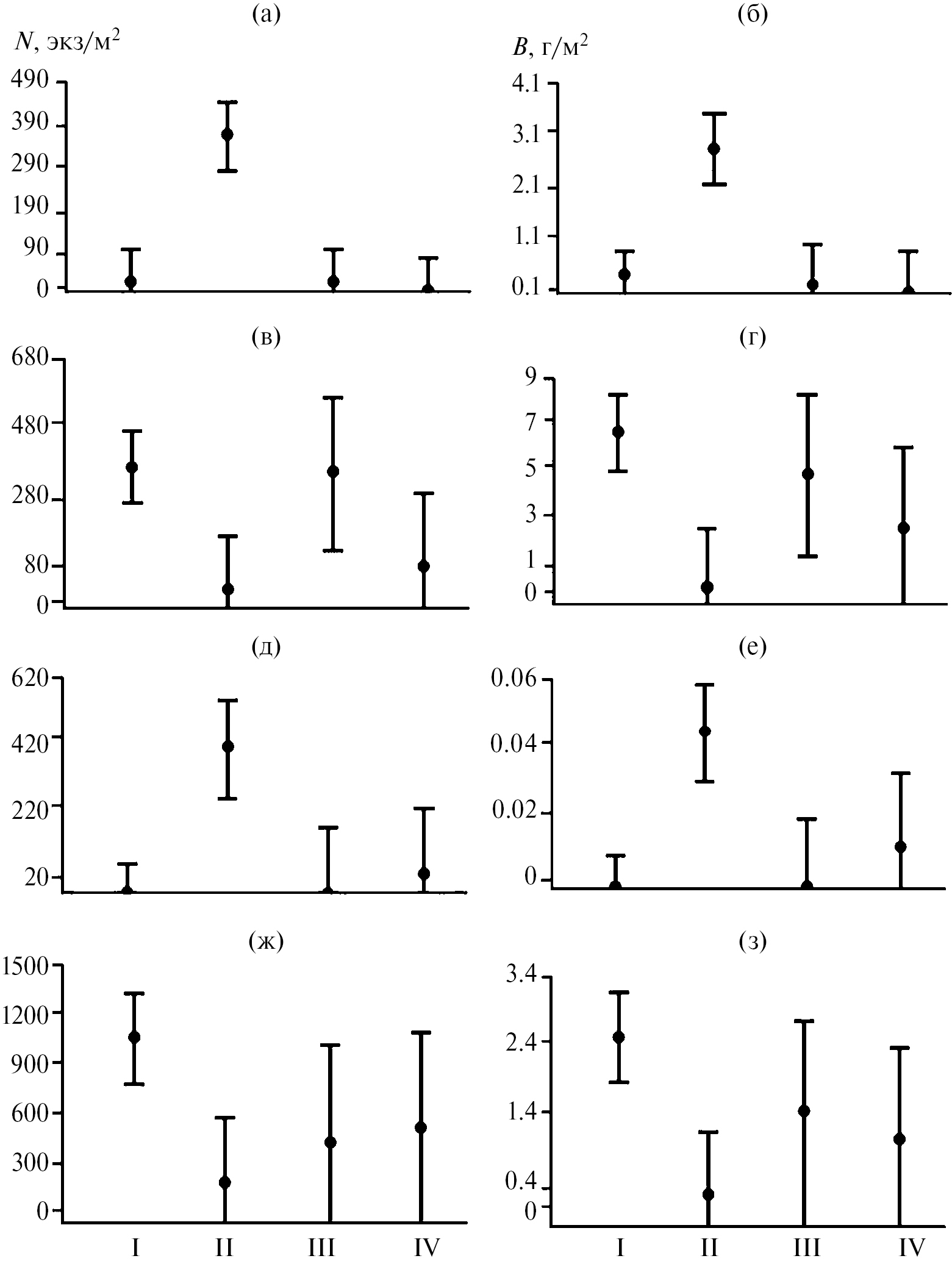 Примечание. S – удельное видовое богатство; N – численность, экз./м2; B – биомасса, г/м2; над чертой – среднее и его ошибка, под чертой – min‒max.