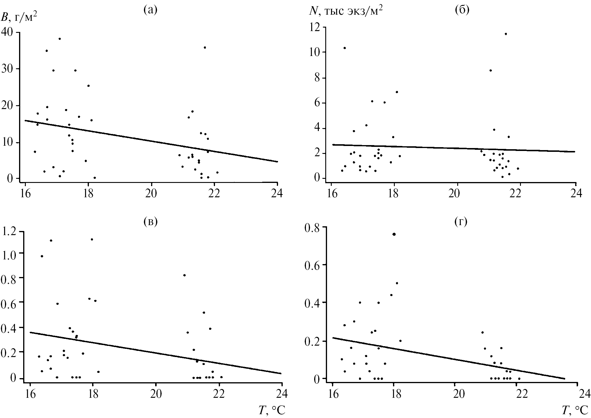 Рис. 7. Связь биомассы (B) и численности (N) макрозообентоса (а, б) и хищников–активных хватателей (в, г) с температурой придонного слоя воды.