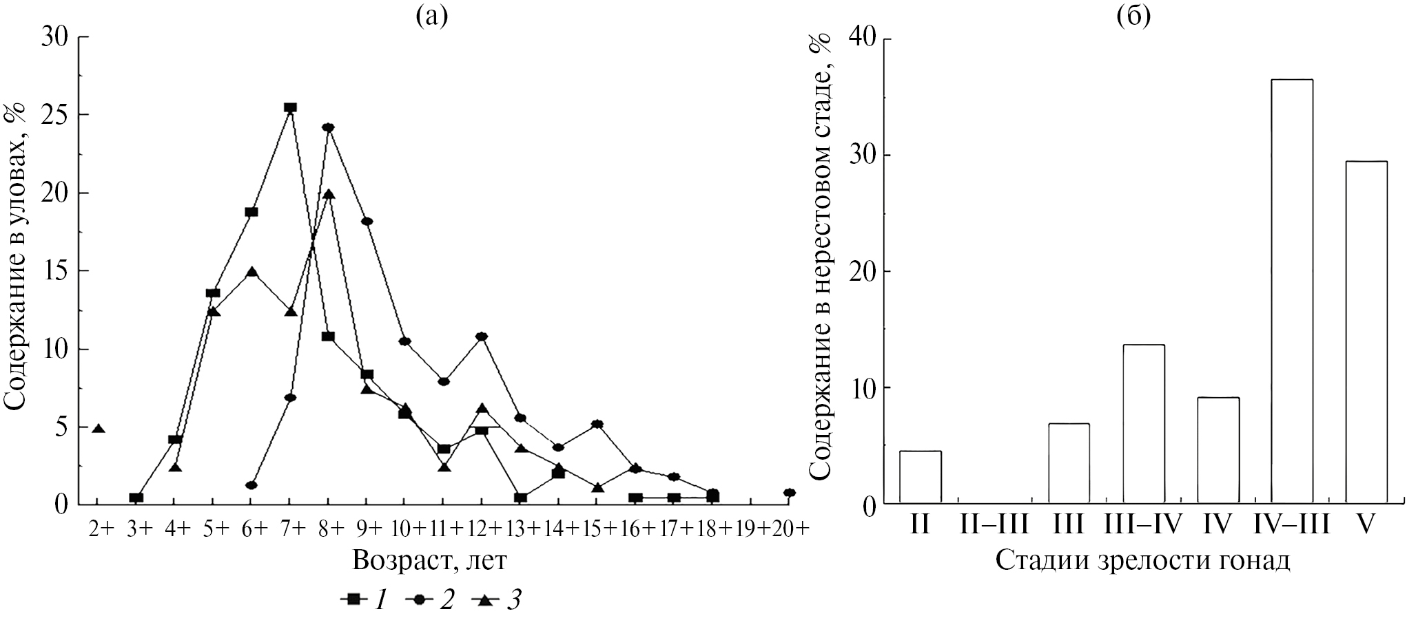 Рис. 2. Возрастная структура (а) и соотношение стадий зрелости гонад в промысловом стаде (б) в период преднерестовых концентраций (май) стерляди р. Северная Двина. 1 – верховья, 2 – среднее течение, 3 – низовья.