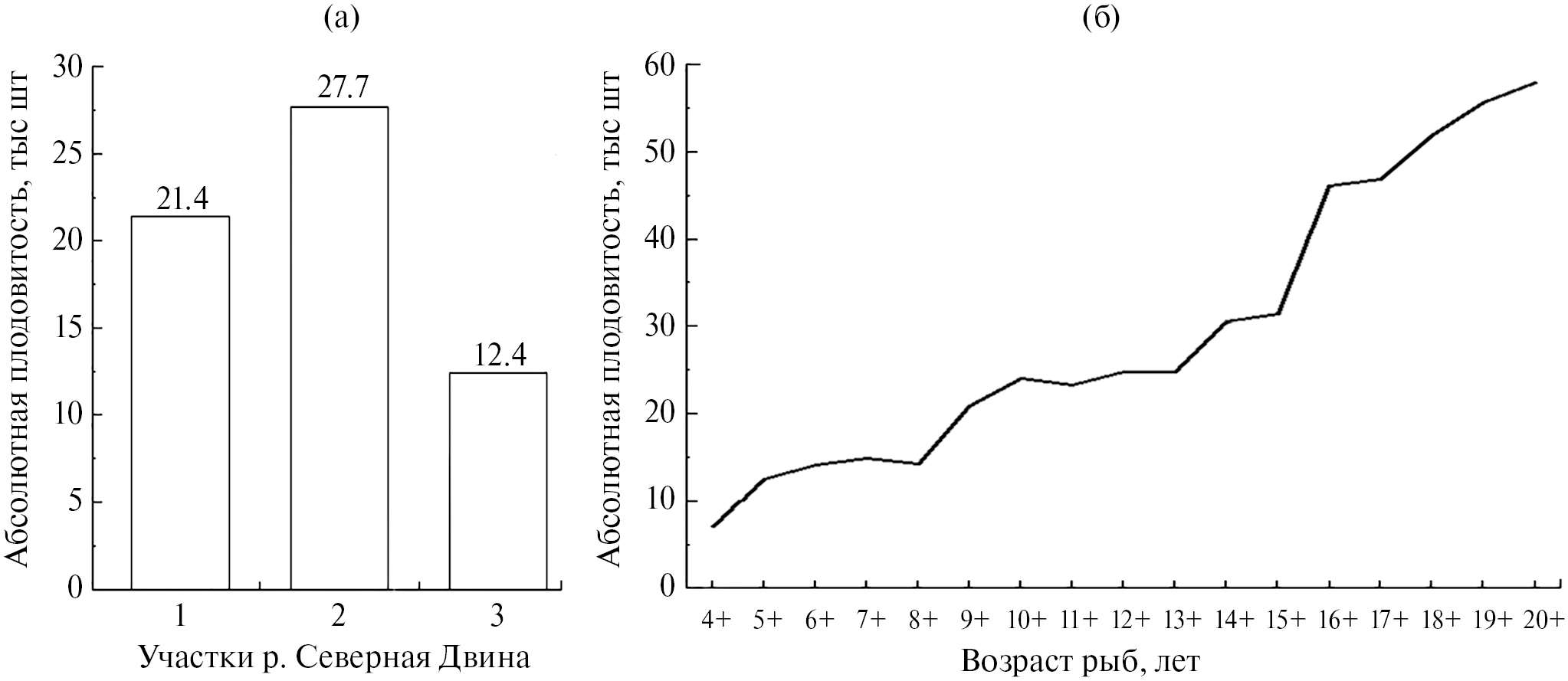 В конце мая–начале июня >75% половозрелых рыб характеризуются уже готовыми к нересту гонадами, находящимися на IV, переходной IV–V и текучей V стадиях зрелости. Показатель индивидуальной абсолютной плодовитости северодвинской стерляди изменяется в значительных пределах – от 3.7 тыс. икринок до 97.6 тыс. икринок (в среднем для всего бассейна – 25.3 тыс. икринок). При этом на разных участках Северной Двины показатели абсолютной плодовитости имеют разные значения (рис. 3а). Анализ возрастного состава половозрелых самок стерляди свидетельствует об увеличении абсолютной плодовитости у рыб старших возрастных групп (рис. 3б).
