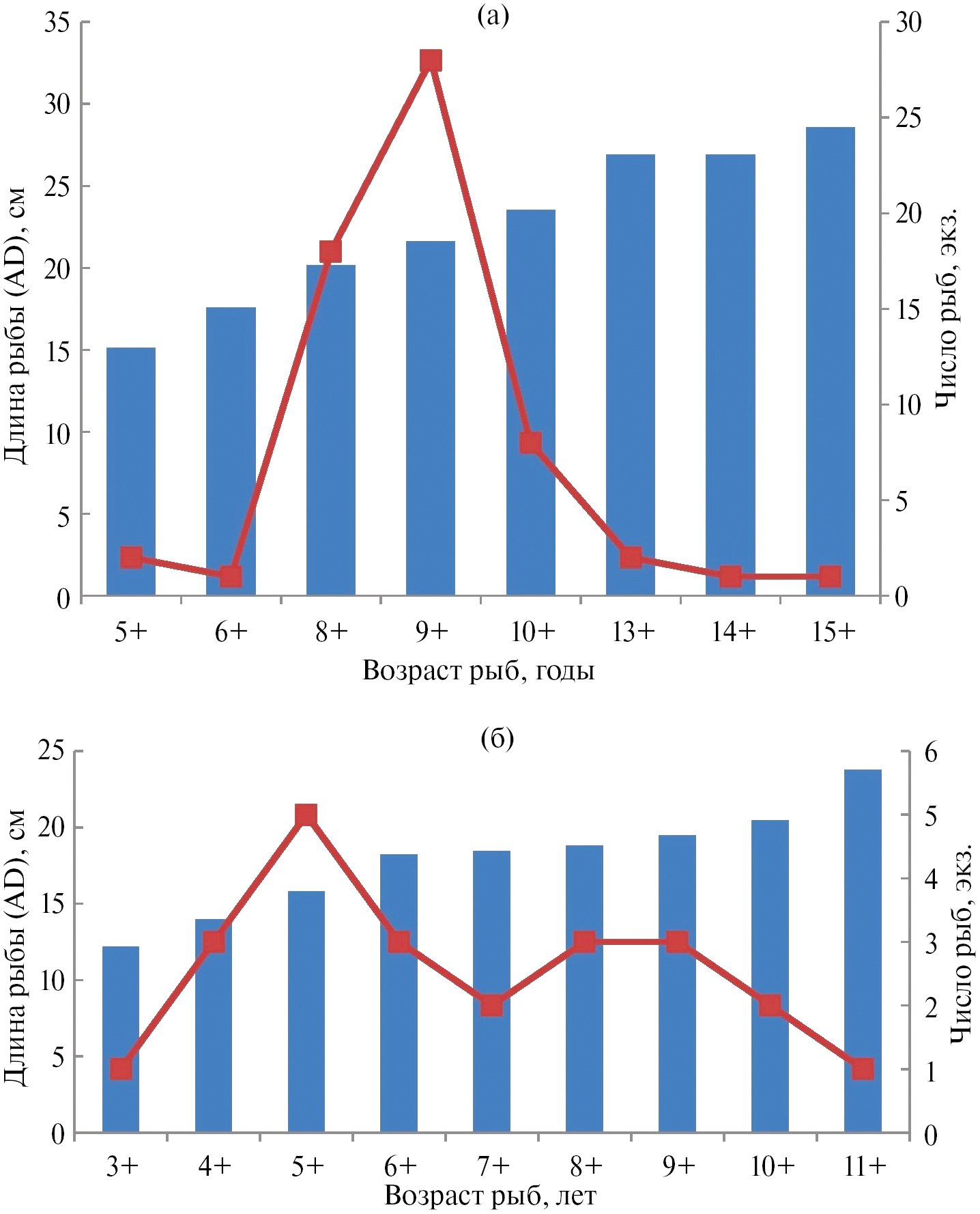 Рис. 4. Размерно-возрастная характеристика синца (а) и красноперки (б) Кенозера из контрольных уловов в 2019 г. Сплошной линией обозначено число исследованных рыб, экз.
