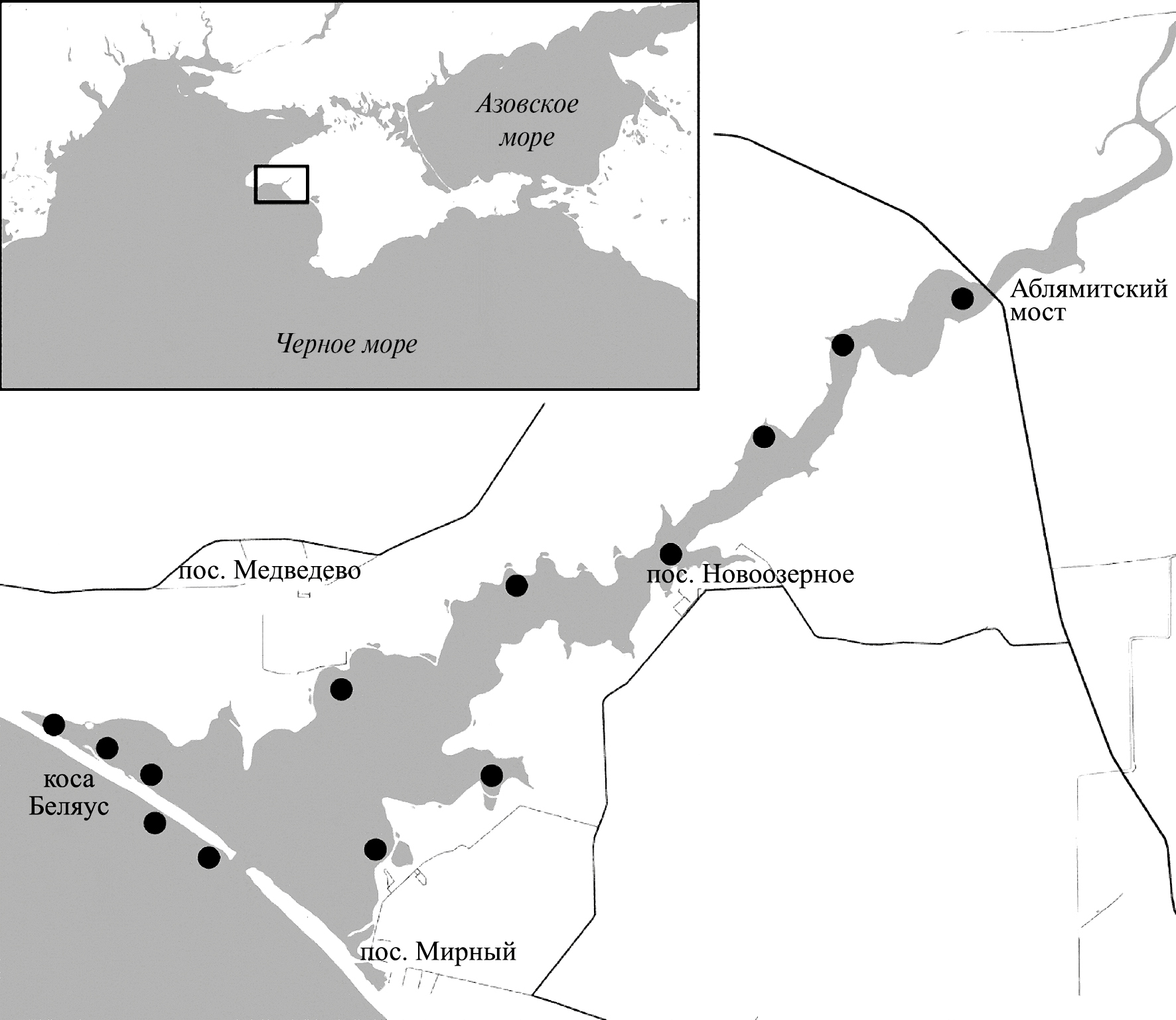Рис. 1. Схема станций отбора проб в оз. Донузлав и акватории косы Беляус. l – место отбора проб.