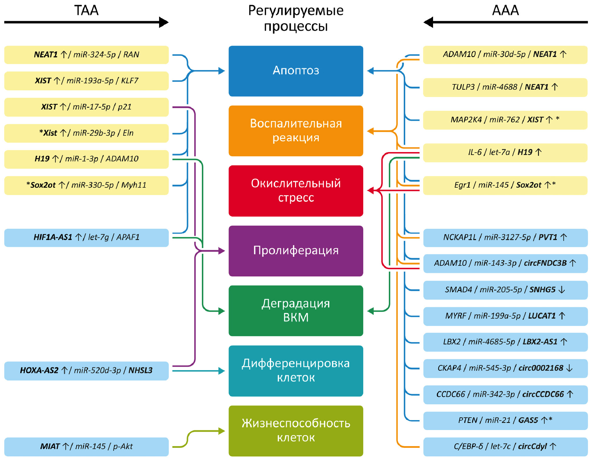 Принятые сокращения: АА – аневризма аорты; ААА – абдоминальная аневризма аорты; ВКМ – внеклеточный матрикс; ГМКС – гладкомышечные клетки сосудов; ДЭГ – дифференциально экспрессирующиеся гены; ТАА – торакальная аневризма аорты; circRNA – кольцевые РНК; lncRNA – длинные некодирующие РНК.
