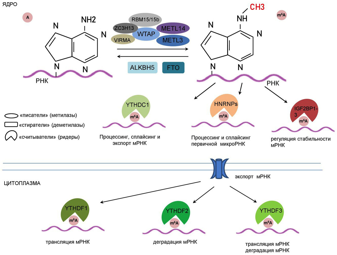 Таким образом, для m6A известны белки, которые регулируют уровень распределения этой модификации в клетке, а именно метилазы и деметилазы, а также m6A-связывающие белки («считыватели»), интерпретирующие данную модификацию в различных биологических системах (рис. 1).