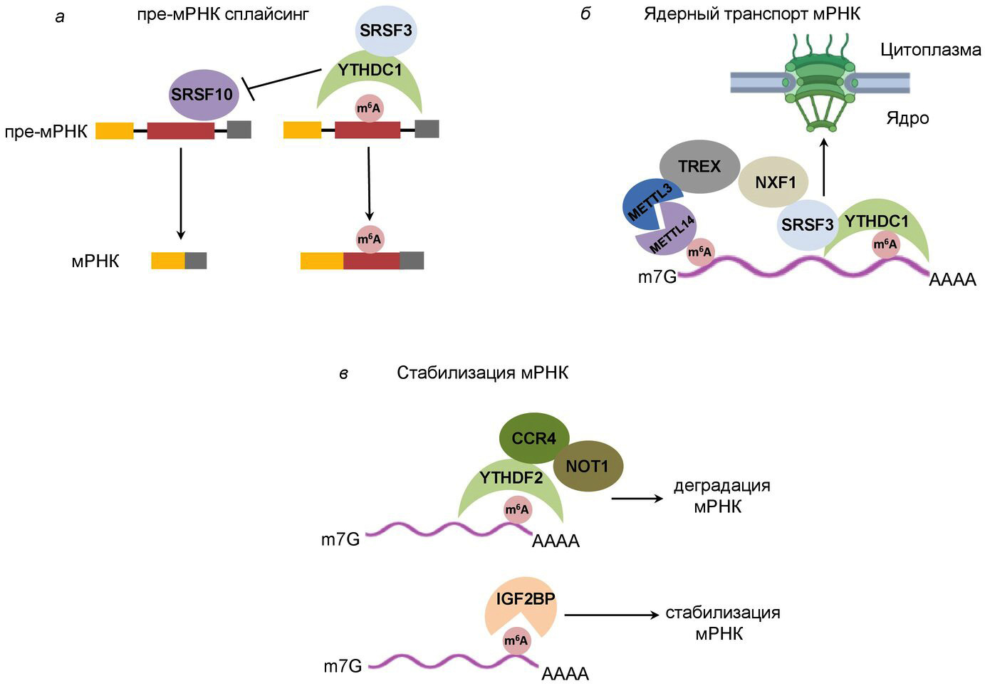 Помимо ядерно-цитоплазматического транспорта, m6A-метилирование может ускорять деградацию или стабилизацию ядерных мРНК. Так, метил-РНК-связывающий белок-«считыватель» YTHDF2 распознаёт m6A-РНК в сайтах связывания с консенсусной последовательностью «GAAC», привлекая деаденилазный комплекс CCR4–NOT1, что приводит к деградации мРНК [79]. В то же время белки-«считыватели» m6A семейства IGF2BP распознают АТ-обогащённые участки m6A-РНК, стабилизируя и сохраняя её в нетранслируемом состоянии (рис. 2, в) [49]. Интересно, что высокий уровень экспрессии этих белков характерен для различных видов рака [77].