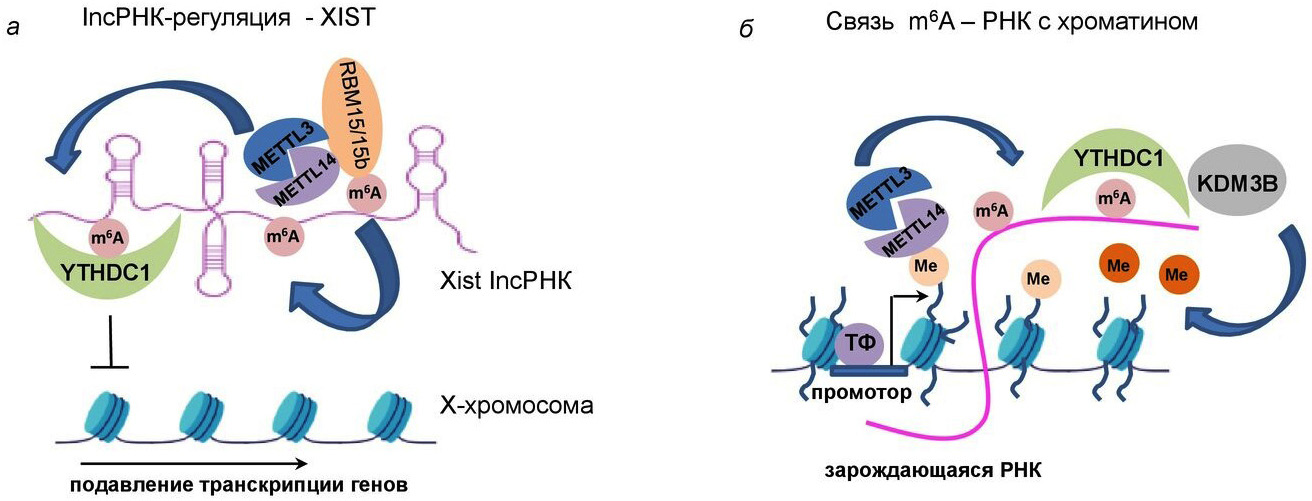 ДнкРНК являются критическими регуляторами эпигенетических механизмов [82]. Например, днкРНК XIST имеет решающее значение для поддержания компенсации дозы экспрессии генов между полами, полностью «покрывая» одну из Х-хромосом у женщин и подавляя экспрессию генов в одной из копий X-хромосомы [83]. Недавняя работа показала, что для функциональной активности XIST необходимы химические модификации lncРНК [16]. Используя метод, позволяющий картировать m6A с разрешением до отдельных нуклеотидов (miCLIP), Patil et al. выявили 78 предполагаемых сайтов m6A на XIST рядом с областью повтора аденина (A) и показали, что в процесс метилирования аденозина в XIST-РНК, а также в клеточных мРНК вовлечены РНК-связывающий белок 15 (RBM15) и его паралог RBM15B [16]. Эксперименты по ко-иммунопреципитации показали взаимодействие между RBM15/RBM15B и METTL3, зависимое от присутствия WTAP. Используя доксициклин-индуцируемую систему экспрессии XIST, авторы продемонстрировали, что нокдауны RBM15 и RBM15B не влияли на подавление экспрессии мишеней XIST, Gpc4 и Atrx, тогда как двойной нокдаун RBM15/RBM15B приводил к существенному увеличению транскрипции Gpc4 и Atrx[16]. Эти результаты предполагают, что функции RBM15 и RBM15B существенно пересекаются. Кроме того, нокдаун RBM15/RBM15B значительно понижал количество m6A на XIST-РНК. Взаимодействие RBM15/RBM15B с XIST-РНК привлекает остальных членов метилтрансферазного комплекса, что, в свою очередь, приводит к метилированию аденозиновых нуклеотидов в соседних консенсусных мотивах. С такими участками может связываться белок YTHDC1 и, как результат, подавлять транскрипцию XIST-РНК [16] (рис. 3, а).