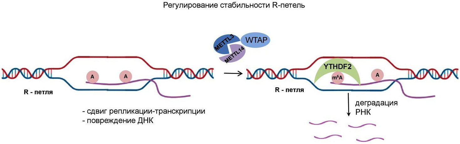 Роль m6A в регуляции метаболизма R-петель. R-Петли – это трёхцепочечные структуры, которые формируются из свободной одноцепочечной цепи ДНК и РНК:ДНК гибрида. Эти структуры присутствуют во всех живых организмах, от бактерий до эукариот, и составляют порядка 5, 8 и 10% от полного генома человека, дрожжей и Arabidopsis thaliana соответственно [89–91].