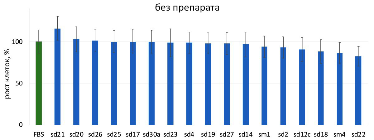 Рис. 2. Скорость роста клеток SK-BR-3 в среде, содержащей 5% FBS и 4% сыворотки крови человека, полученной от различных доноров. Скорость роста нормализована по отношению к среде, содержащей только FBS (9% FBS; столбец «FBS»)