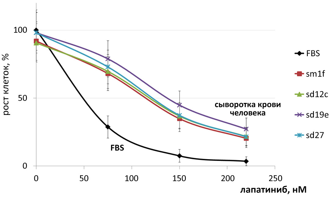 Сыворотка крови человека снижает влияние лапатиниба на рост клеток SK-BR-3. На эффективность терапевтических препаратов в подавлении роста опухоли могут влиять различные молекулярные факторы, присутствующие в организме пациента. В этой работе мы измерили влияние индивидуальных образцов сыворотки периферической крови человека на скорость роста клеток, полученных из аденокарциномы молочной железы, SK-BR-3, в присутствии лапатиниба, ингибитора тирозинкиназ, который предотвращает фосфорилирование и активацию HER2 и EGFR [19].