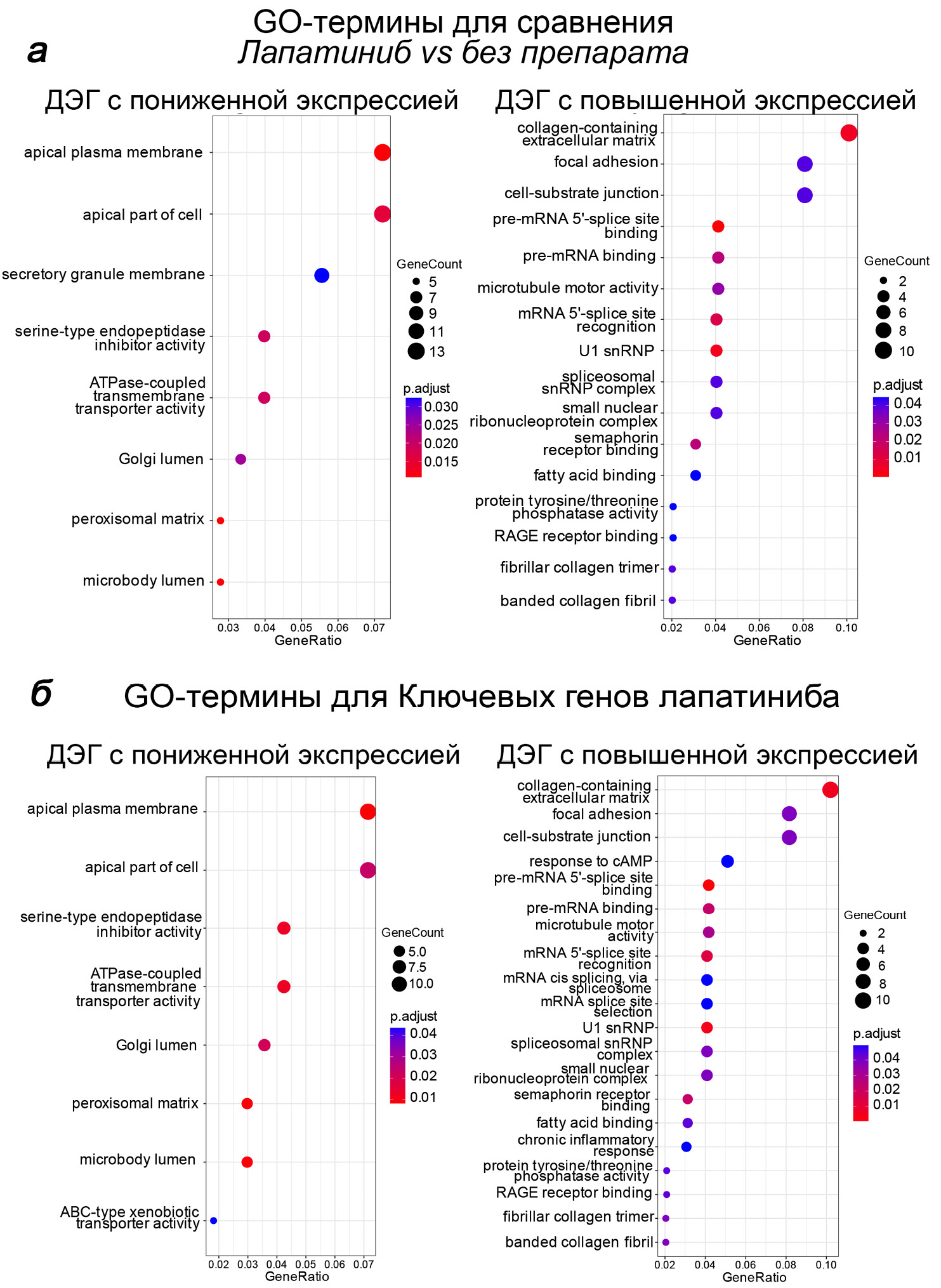 Рис. 9. Термины базы данных Gene Onthology (GO), наиболее обогащённые для генов из множества ДЭГ с повышенной и пониженной экспрессией, вызванной обработкой лапатинибом (а) и набором ключевых генов лапатиниба (lapatinib core) (б). Визуализировано с помощью пакета R enrichplot (http://bioconductor.org/packages/ release/bioc/html/enrichplot.html). Обогащение указанных терминов GO статистически значимо (p-значение, скорректированное по критерию Бенджамини–Хохберга, меньше 0,05)