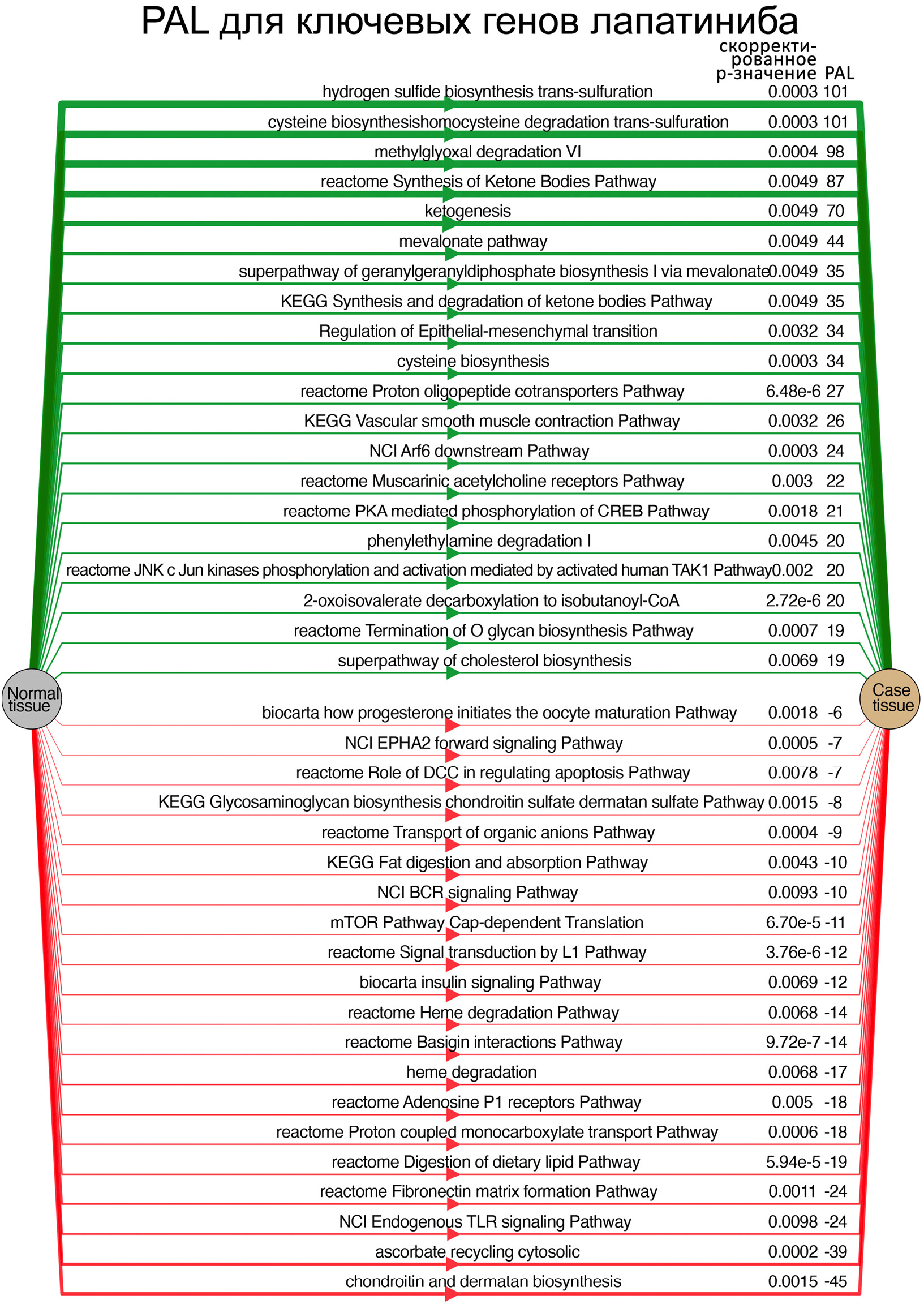 Рис. 10. 20 наиболее сильно активированных и ингибированных молекулярных путей, рассчитанных для набора ключевых генов лапатиниба (lapatinib core) в клетках SK-BR-3. Показаны значение PAL и скорректированное p-значение