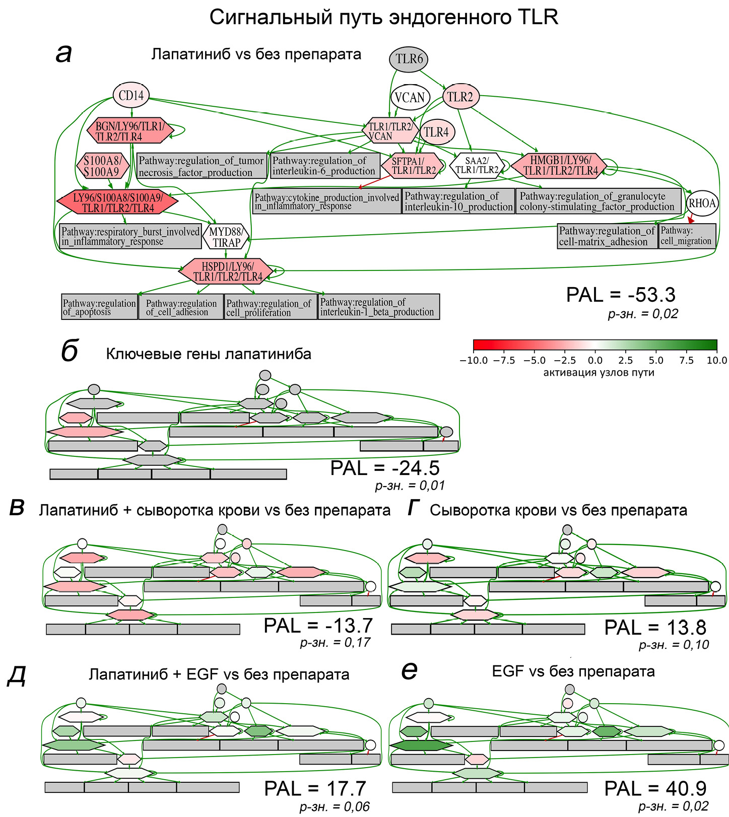 Добавление лапатиниба приводило к резкому снижению активации сигнального пути TLR (рис. 11, а). Однако это снижение сильно ослабевало при добавлении препарата в комбинации с сывороткой крови человека или с EGF (рис. 11, в, г). Анализ группы ключевых генов лапатиниба показал, что ингибирование узла TLR6 этого пути не связано с ингибированием роста клеток, в то время как ингибирование узла CD14, скорее всего, с ним связано. Полученные нами результаты свидетельствуют о том, что клетки, обработанные EGF или сывороткой крови человека, можно считать частично устойчивыми к обработке лапатинибом. В этих клетках узлы S100A8/S100A9 и LY96/S100A8/S100A9/TLR1/TLR2/TLR4 оказались активированы по сравнению с уровнем без препарата.