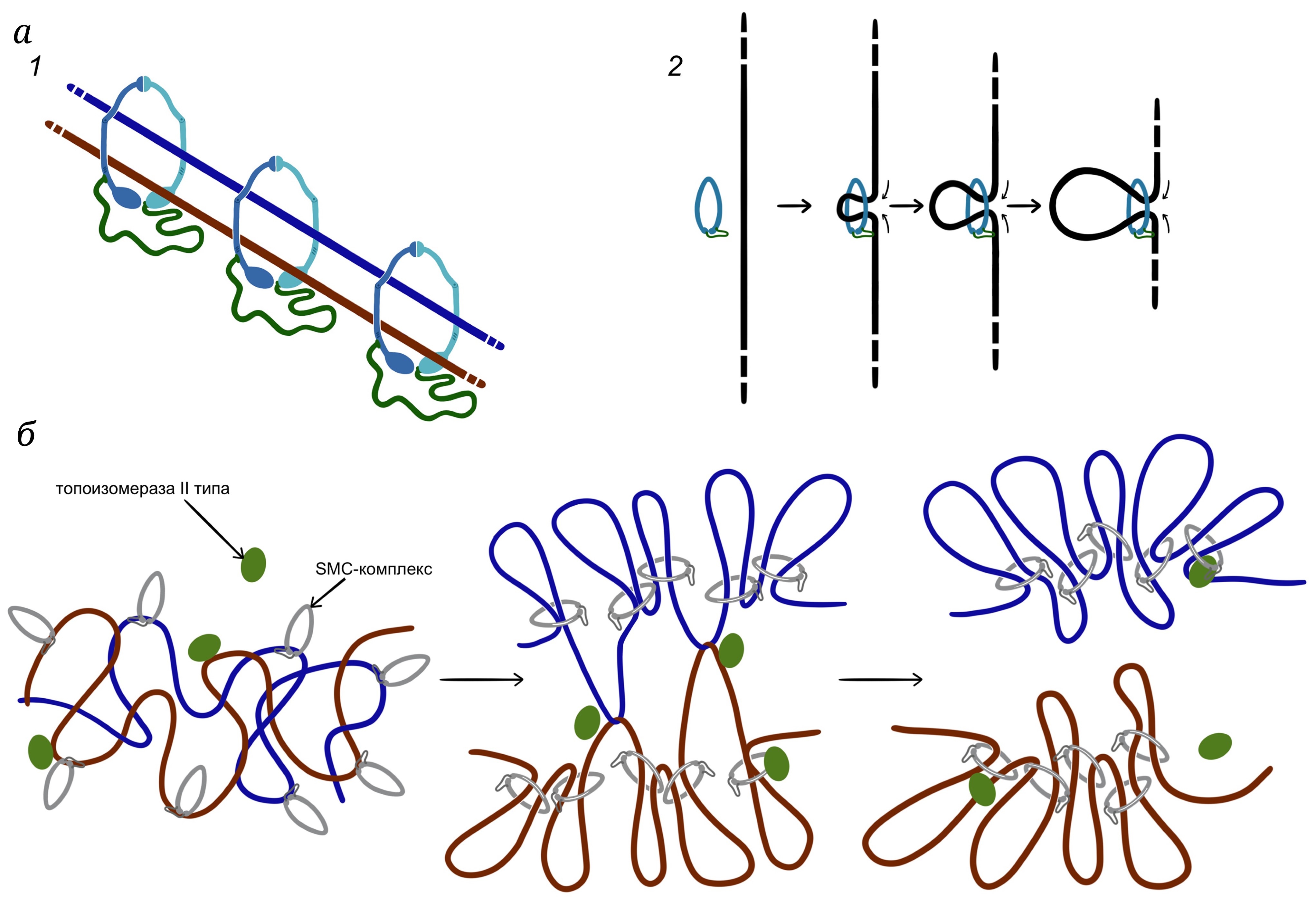 В клетках эукариотических организмов когезин выполняет две различные функции: обеспечение когезии сестринских хроматид и так называемую экструзию хроматиновых петель (рис. 1, а). Процесс экструзии начинается с захвата небольшой ДНК-петли, после чего ее рост происходит за счет процессивного затягивания фланкирующих участков ДНК внутрь [3–6]. В основании растущих петель располагается активный SMC-комплекс, а их размер может достигать сотен тысяч пар оснований (рис. 1, а (2)). Экструзионная активность сопряжена с гидролизом ATP и является универсальной биохимической активностью всех SMC-комплексов [1]. По всей видимости, экструзия возникла на заре клеточной эволюции как способ пострепликативного разделения массивных молекул геномной ДНК (рис. 1, б); в этом процессе SMC-комплексы кооперируют с топоизомеразами II типа. Обеспечиваемая когезиновыми кольцами когезия сестринских хроматид (рис. 1, а (1)), по всей вероятности, не связана с экструзионной активностью комплекса [7, 8], хотя для погрузки на ДНК когезиновых колец, участвующих в когезии, также необходим гидролиз ATP [7, 9].
