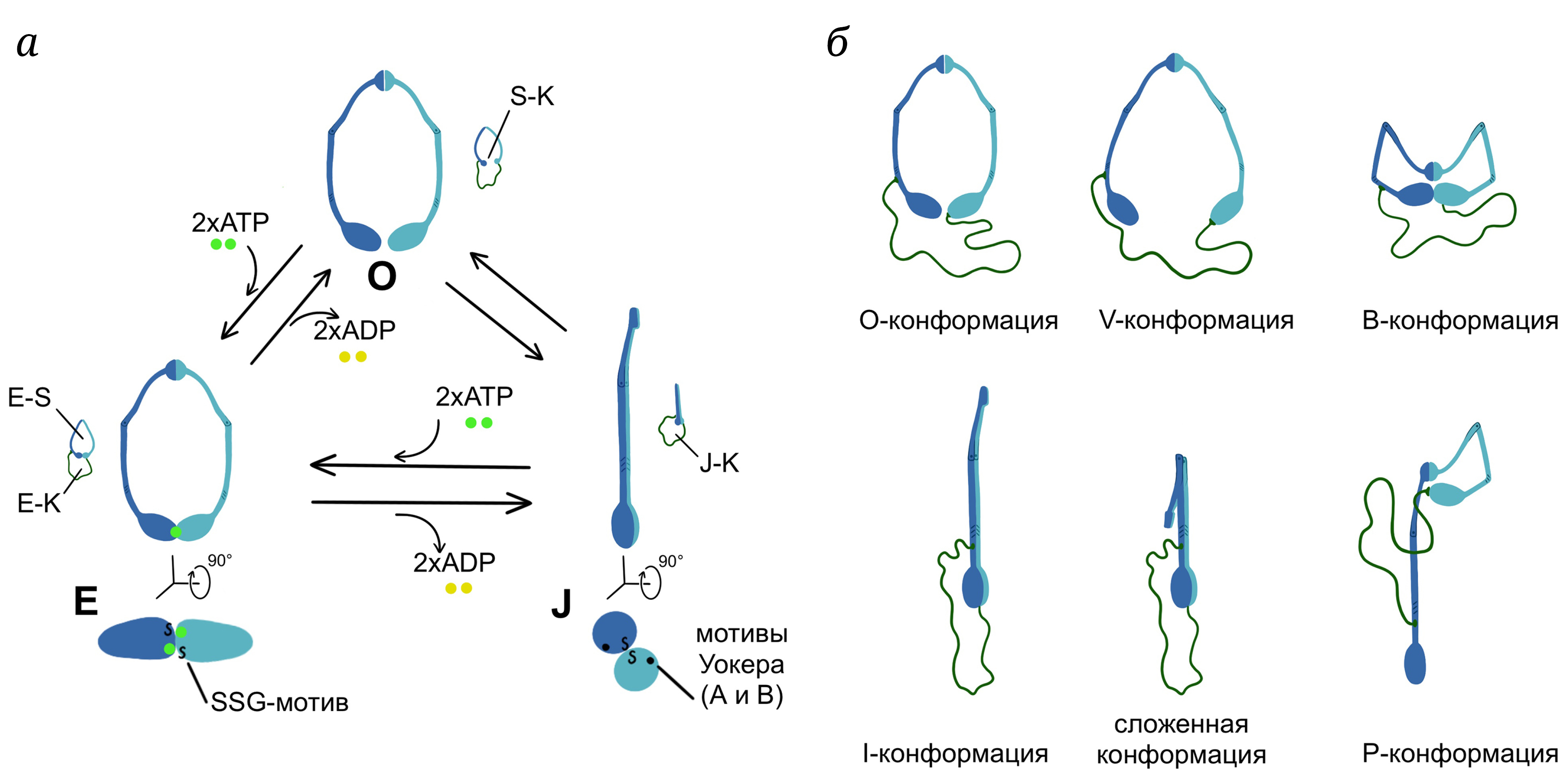 Рис. 3. Разнообразие конформационных состояний когезина. а – O-, E- и J-конфигурации головных доменов когезина и переходы между ними, RAD21-субъединица не показана для ясности рисунка. На пиктограммах обозначены S-K-кольцо и субкомпартменты (E-S, E-K и J-K), образуемые при взаимодействии головных доменов между собой. б – Основные конформационные состояния когезина, обнаруженные с помощью микроскопических методов