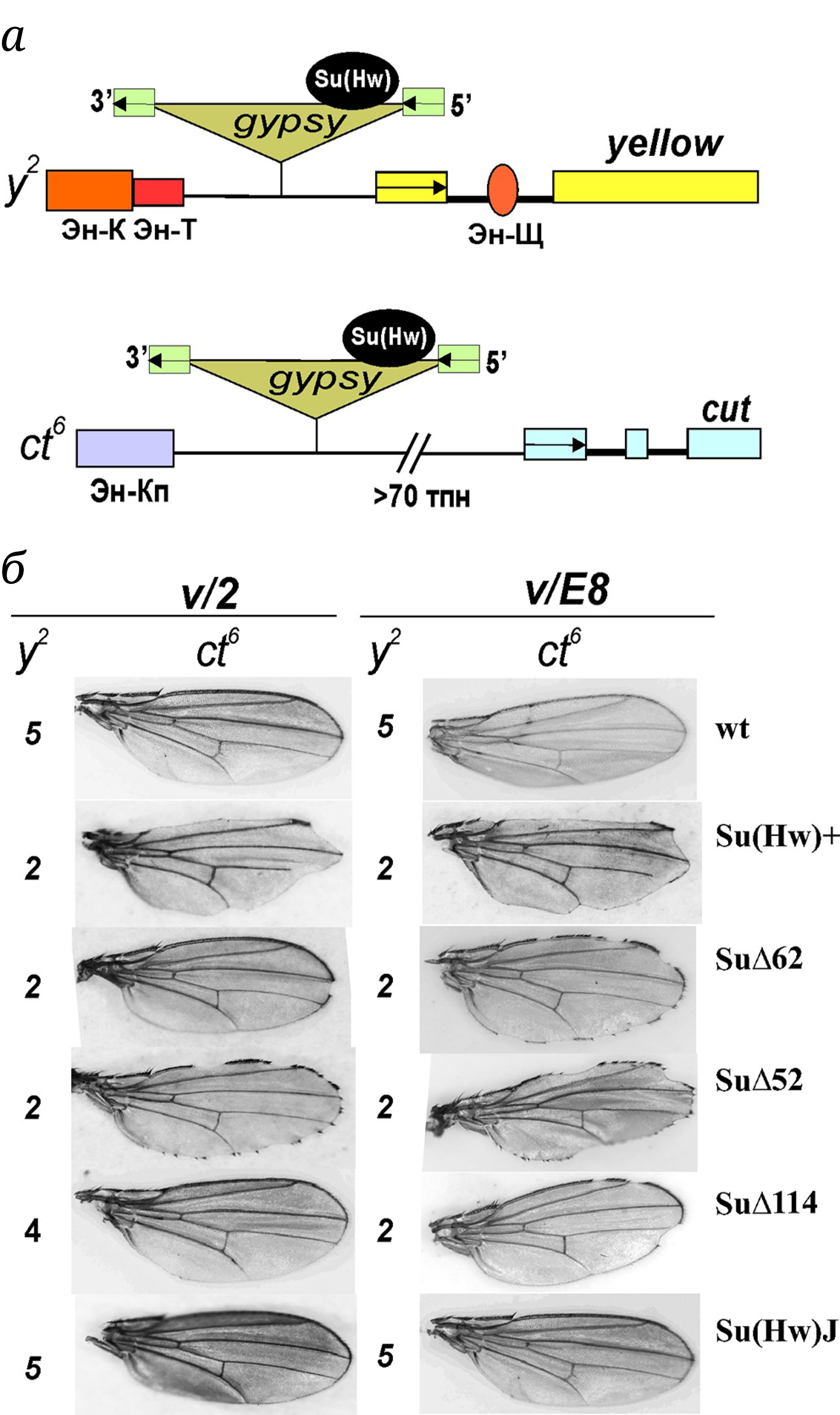 Ген yellow отвечает за пигментацию кутикулярных структур дрозофилы [38]. В диком типе тело, крылья и щетинки мух окрашены в тёмный цвет. В аллеле y2 ретротранспозон gypsy встроился между энхансерами тела и крыльев и промотором гена yellow (рис. 2, а). В этом случае инсулятор Su(Hw) полностью блокирует активацию экспрессии yellow в теле и крыльях, в результате чего тело и крылья мутантных мух приобретают жёлтую окраску (рис. 2, б). Однако щетинки мух остаются пигментированными, т.к. энхансер щетинок расположен в интроне гена [39].