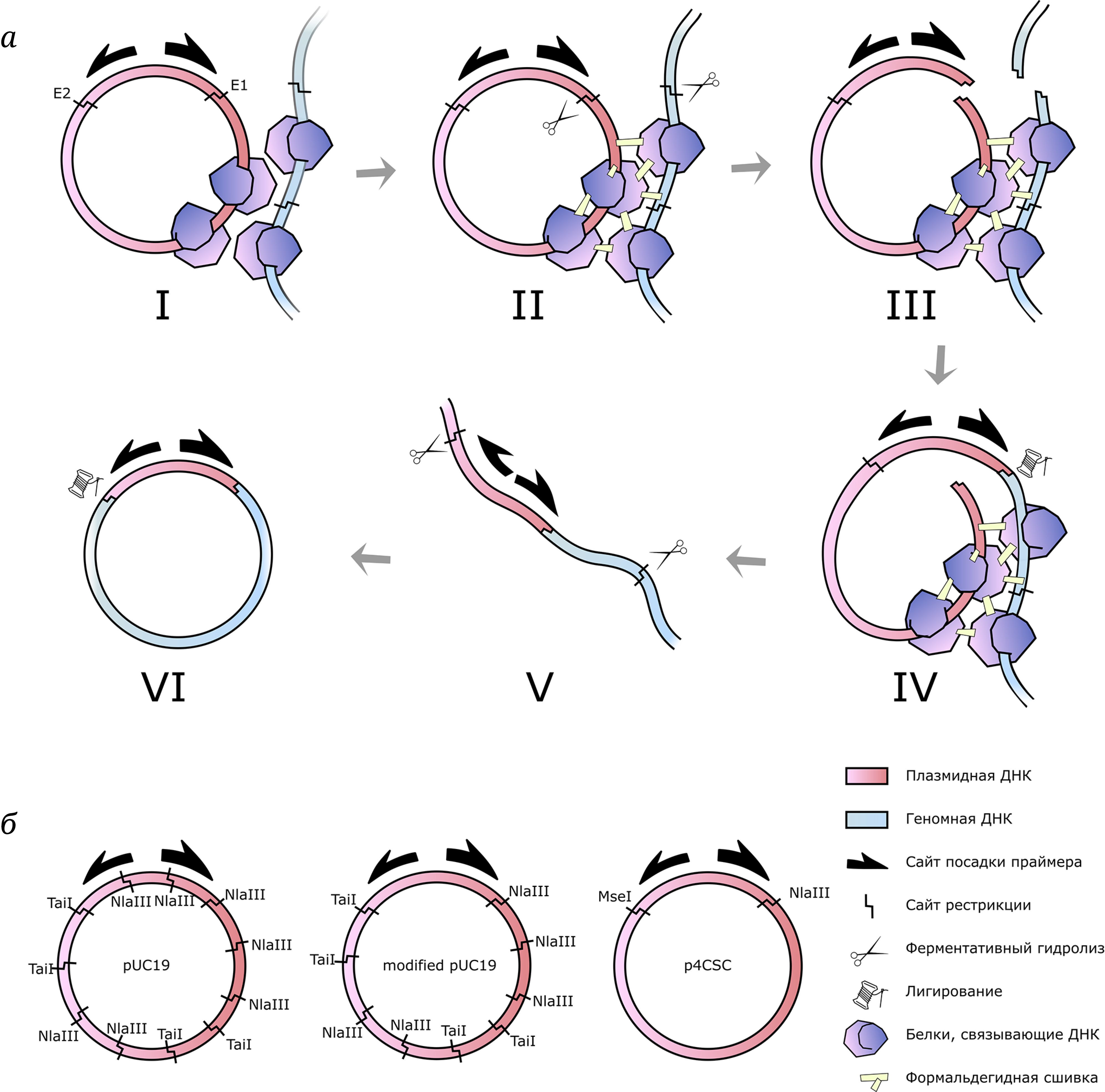 Рис. 1. Дизайн 4С-эксперимента с плазмидным вектором. а – Общий дизайн эксперимента (I–VI). б – Схема расположения сайтов рестрикции плазмидных векторов, используемых в данной работе. Карты и последовательности плазмид представлены на рис. П1–П3 и в тексте 2 в Приложении