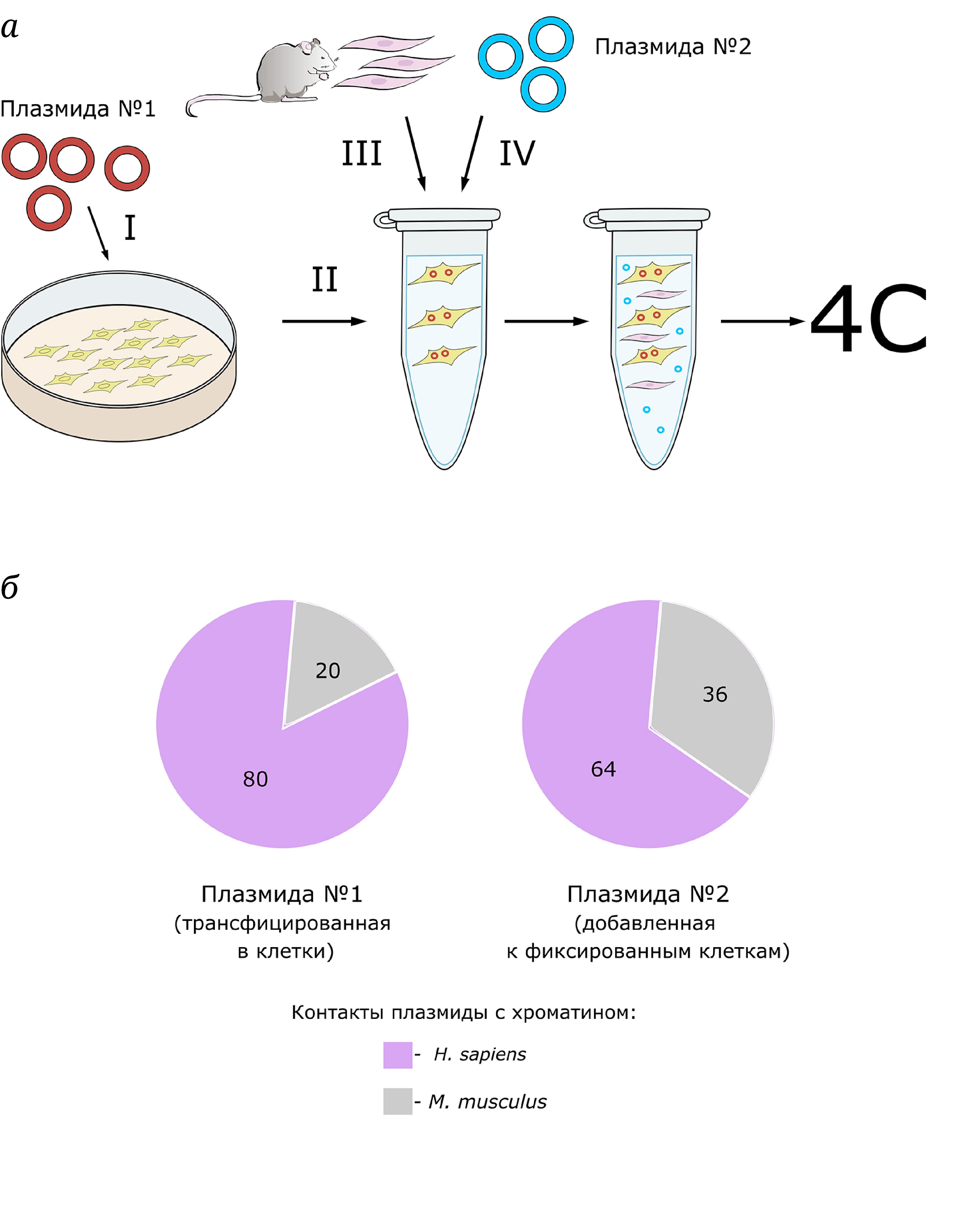 Рис. 2. Оценка доли «случайных» контактов. а – Схема эксперимента: плазмиду № 1 трансфицировали в клетки HEK293T (I), затем пространственные контакты ДНК и белков в ядре фиксировали формальдегидом (II). К полученному образцу добавляли фиксированные фибробласты Mus musculus (III), плазмиду № 2 (IV) и выполняли 4С-эксперимент. б – Плазмида № 1 и плазмида № 2 различаются по соотношению количества контактов с хроматином H. sapiens и M. musculus. На диаграммах показано процентное соотношение контактов плазмиды с соответствующим хроматином, усредненное по трем независимым экспериментам. Результаты по отдельным репликам представлены на рис. П4 в Приложении. Общее количество контактов принято за 100%