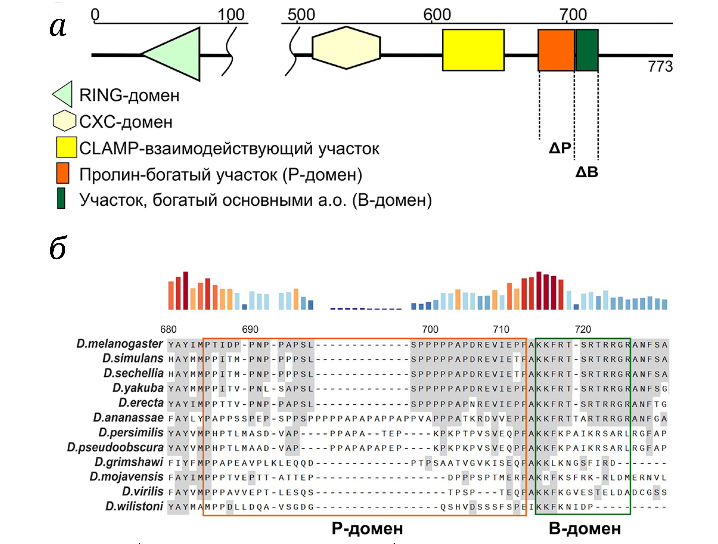 Рис. 1. Структурная организация белка MSL2. а – Схема белка MSL2. Показаны основные домены: RING, CXC, CLAMP-взаимодействующий, Р и В. б – Выравнивание (Clustal Omega) последовательности C-концевой части белка MSL2 у хорошо исследованных видов Drosophilidae. Р-Домен выделен оранжевой рамкой, В-домен – зеленой