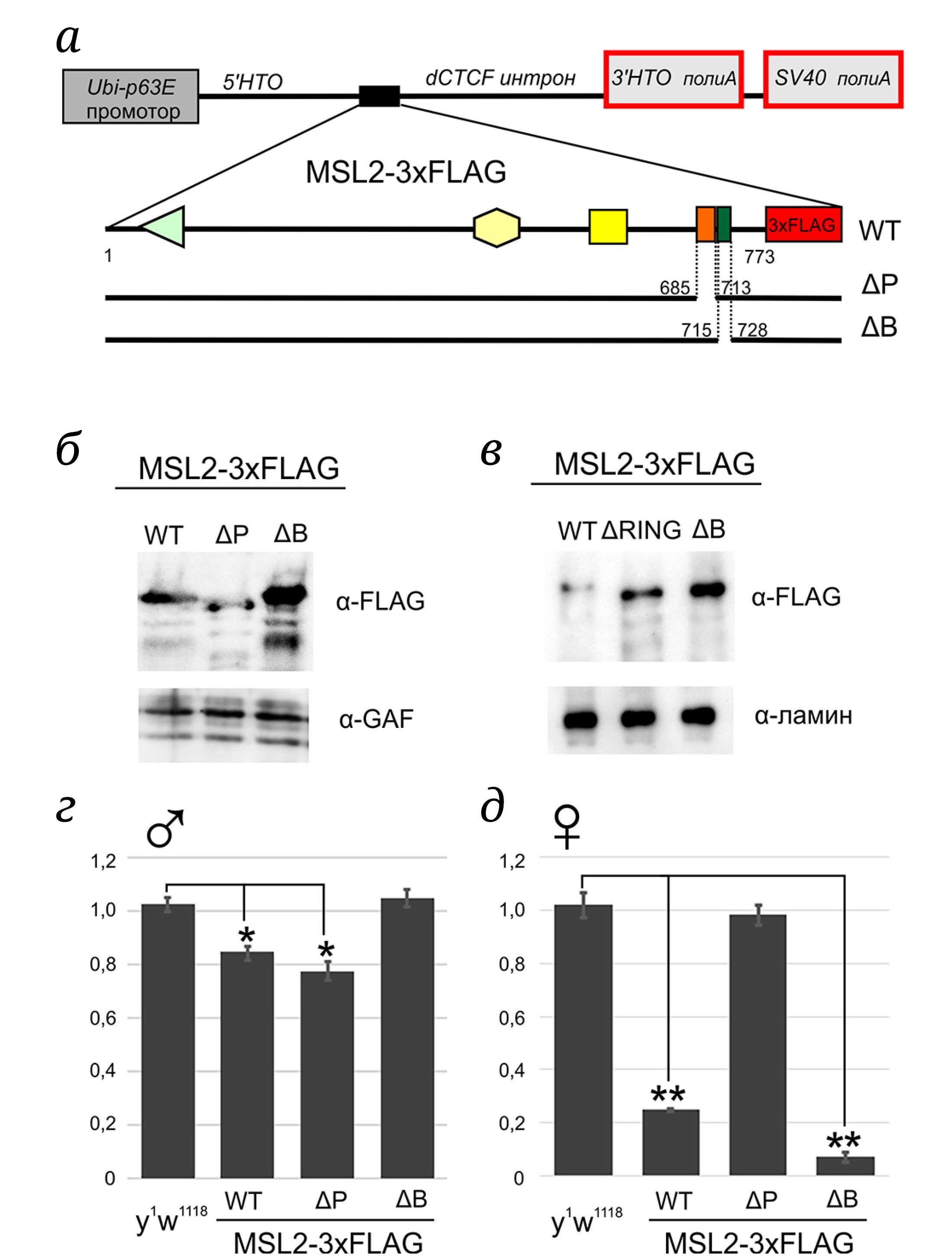 Рис. 2. Получение трансгенных линий, экспрессирующих мутантные белки MSL2. а – Схема используемого экспрессирующего вектора. Показаны промотор и 5′-НТО гена Ubiquitin-63E, последний интрон, 3′-НТО и сигнал полиаденилирования (полиА) гена dctcf, а также сигнал полиаденилирования из вируса SV40. Под схемой вектора представлены варианты MSL2, штрих-линиями указаны места вносимых делеций. б – Иммуноблот-анализ белковых экстрактов, полученных из взрослых мух, экспрессирующих различные варианты MSL2, тагированные FLAG-эпитопом (WT, ΔP, ΔB). Иммуноблот-анализ проводили с использованием антител, специфично узнающих FLAG и GAF (контроль нанесения материала). в – Сравнение экспрессии в S2-клетках белков MSL2WT-FLAG, MSL2ΔRING-FLAG и MSL2ΔB-FLAG. Иммуноблот-анализ проводили с использованием антител, специфично узнающих FLAG и ламин (контроль нанесения материала). г – Сравнение жизнеспособности (в относительных единицах) взрослых самцов msl2γ227/msl2γ227, в которых были экспрессированы варианты MSL2-3хFLAG (WT, ΔP, ΔB). Соотношение самцов msl2γ227/CyO, экспрессирующих варианты MSL2, использовали в качестве внутреннего контроля, демонстрирующего нормальную жизнеспособность. Отношение взрослых самцов линии y1w1118; +/+ к самцам y1w1118; +/CyO использовали как показатель выживаемости линии дикого типа. На гистограмме показаны средние значения со стандартными отклонениями, полученными по результатам трех независимых экспериментов; * p-value < 0,05. д – Жизнеспособность (в относительных единицах) самок, гомозиготных по трансгену, по отношению к взрослым самцам, экспрессирующим варианты MSL2. На гистограмме показаны средние значения со стандартными отклонениями, полученными по результатам трех независимых экспериментов; ** p-value < 0,01