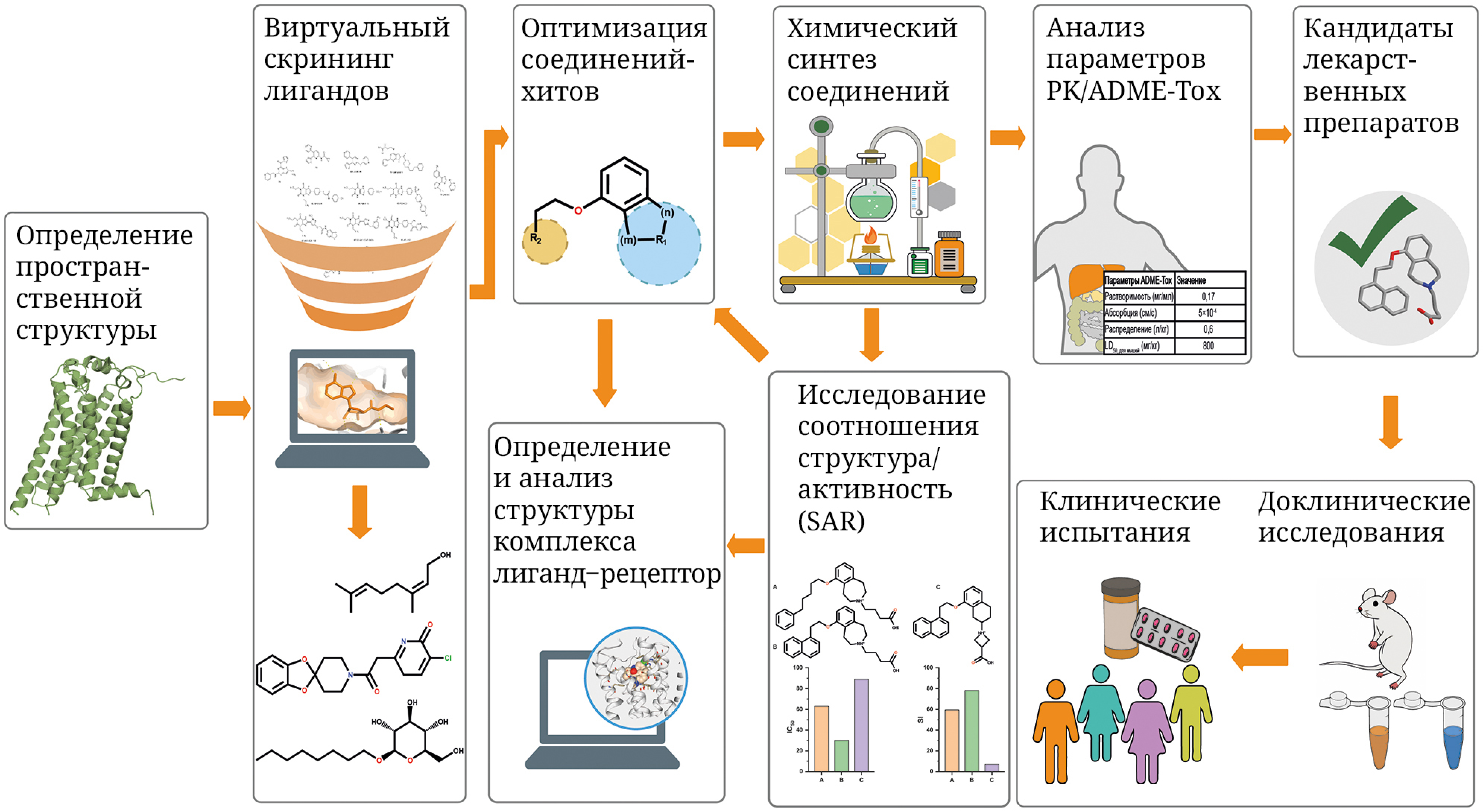 Разработка лекарственных средств представляет собой сложный, дорогостоящий и многостадийный процесс. Он включает в себя: поиск и валидацию лекарственной мишени; поиск соединений-хитов (hit compounds), которые специфически связываются с мишенью; модификации соединения-хита до соединения-лидера (lead compound), оптимизированного по критериям медицинской химии, и проведение анализа структурно-функциональных зависимостей; отбор соединений-кандидатов; доклинические испытания на животных и клинические испытания [1]. Согласно аналитическим отчетам, для вывода нового терапевтического продукта на фармацевтический рынок требуется в среднем более 13 лет и около 2 миллиардов долларов [2].