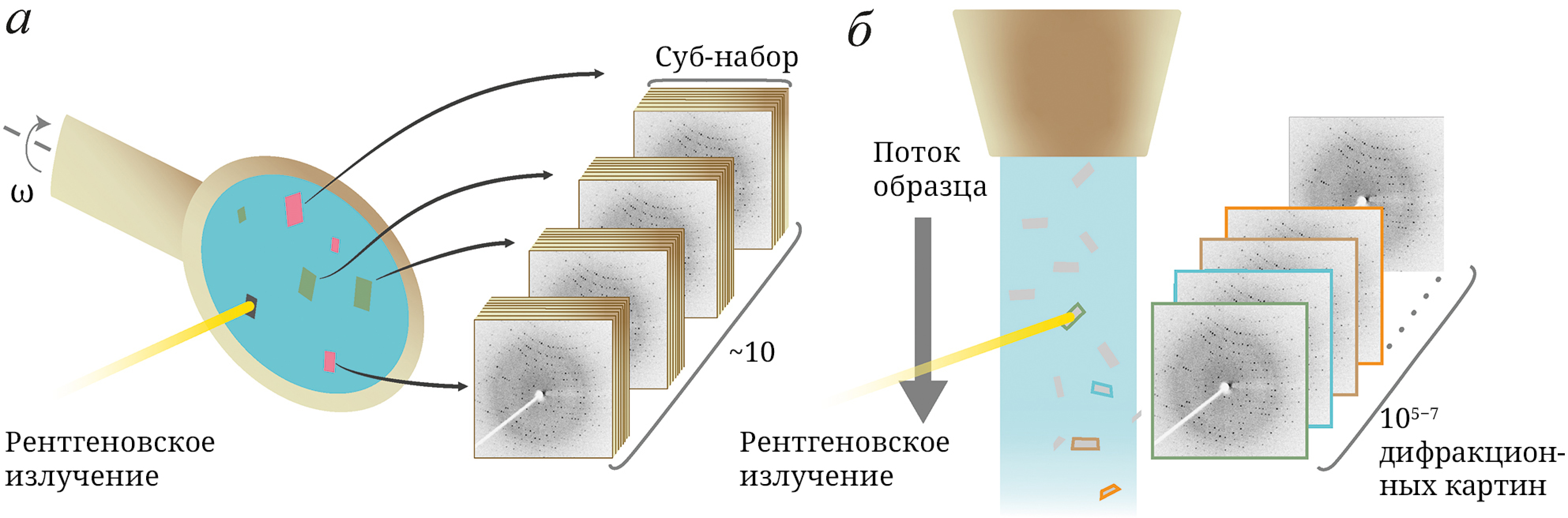 Одним из наиболее трудных этапов белковой кристаллографии все еще является получение хорошо дифрагирующих белковых кристаллов. Метод SWSX оказывается неэффективен, если максимальный размер кристаллов не превышает примерно 5 микрон, поскольку с них не удается собрать данные подходящего качества и даже использовать процедуру предварительного сканирования [74] – максимальная доза облучения у них слишком мала. С появлением XFEL стало возможным успешно проводить эксперименты даже для таких образцов. Его ультраяркое излучение позволяет собирать данные благодаря эффекту «дифракция до разрушения» (diffraction-before-destruction): несмотря на то что кристалл разрушается вплоть до перехода в плазму под ультраярким рентгеновским излучением, дифракционные картины удается детектировать быстрее, чем это произойдет [75]. Данный подход привел к созданию нового семейства методов – серийная фемтосекундная (Serial Femtosecond X-ray Crystallography, SFX) [76] и синхротронная (Serial Synchrotron X-ray Crystallography, SSX) [77] кристаллографии. Их существенное отличие от предыдущих методов в том, что набор данных собирают с тысяч изоморфных малых кристаллов, причем с каждого собирают только одну дифракционную картину [76], таким образом получают набор произвольно ориентированных картин дифракции (рис. 3, б). Друг от друга методы отличаются типом источника излучения.