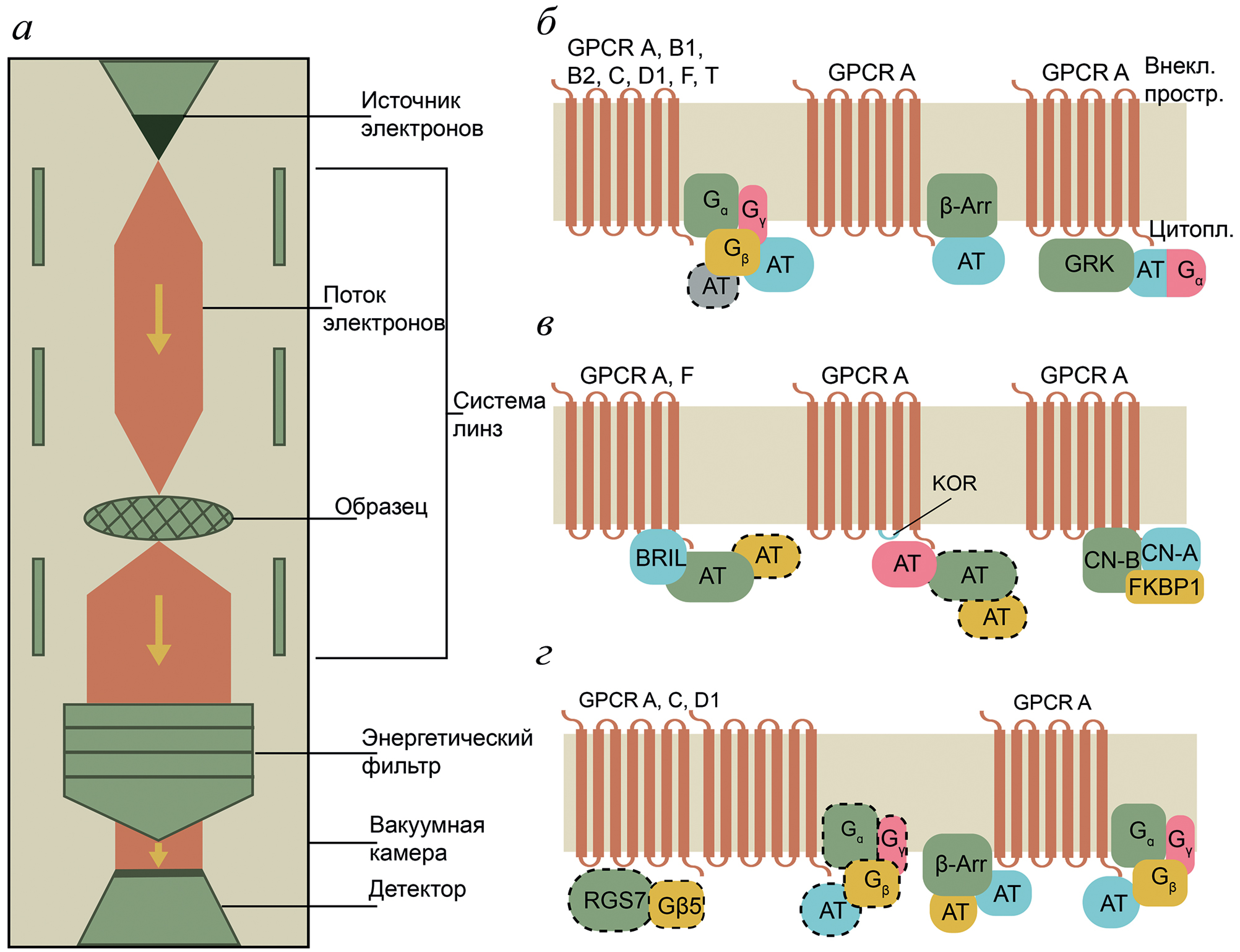 Рис. 4. Крио-ЭМ в исследовании GPCR. а – Схема электронного микроскопа. б – GPCR-комплексы в активном состоянии: комплекс GPCR–G-белок (более 80% структур, полученных методом крио-ЭМ), стабилизированный одним или двумя фрагментами антитела (наиболее популярные – scFv16, Nb-35, а также различные типы Fab); комплекс GPCR–β-аррестин-1, стабилизированный фрагментом антитела (наиболее популярные – scFv30 и Fab30 (gpcrdb.org)); комплексы GPCR–GRK, стабилизированные Fab в случае GRK1, и комплекс GPCR–GRK2–Gα. в – GPCR-комплексы в неактивном состоянии: с использованием белка-партнера в ICL3 (чаще всего BRIL), стабилизированные специфичным к партнеру антителом и, в некоторых случаях, вторичным нанотелом; с заменой ICL3 на ICL3 κ-опиоидного рецептора, стабилизированные специфичным нанотелом и, в некоторых случаях, вторичным Fab или вторичным Fab + анти-Fab Nb («сандвич из антител»); комплекс с заменой ICL3 на CN-B-, а С-конца – на CN-A-субъединицы кальцинейрина, стабилизированного белком FKBP12. г – Мегакомплексы GPCR: гомо- и гетеродимеры в активном и неактивном состояниях, в комплексе с G-белком (для некоторых активных структур) и с регулятором G-белок-сигнализации, связанным с белком Gβ5 (для некоторых неактивных структур) [99]; мегакомплекс GPCR с G-белком и β-аррестином, стабилизированный антителами