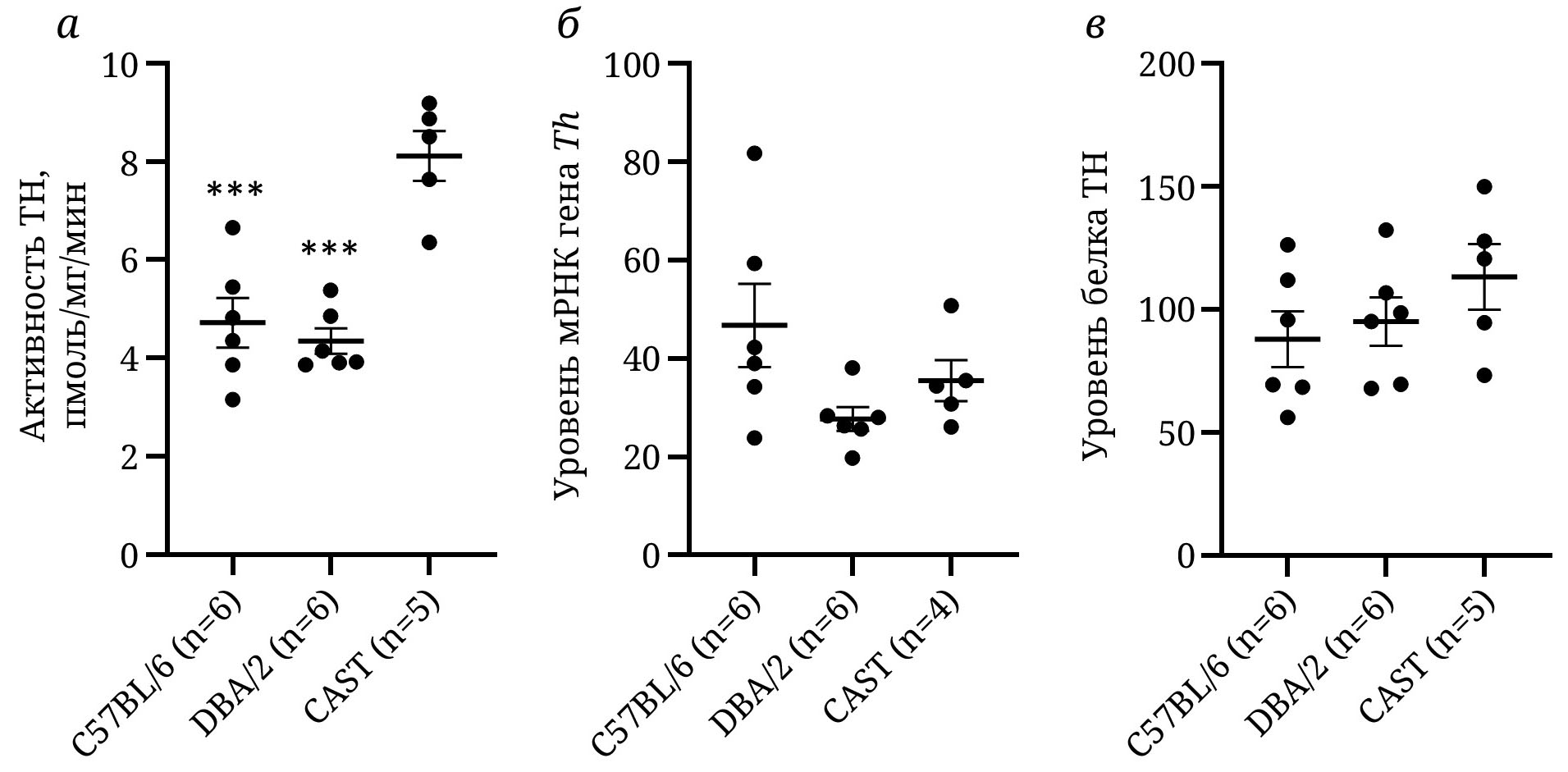 Рис. 1. Активность TH (а), уровень мРНК гена Th (б) и уровень белка TH (в) в среднем мозге мышей инбредных линий C57BL/6 (TT), DBA/2 (TT) и подвида CAST (CC). Представлены индивидуальные значения, средние ± ошибки средних. Экспрессия гена Th калибрована на экспрессию гена Polr2а, а уровень белка TH калиброван на уровень белка GAPDH. *** p < 0,001 vs CAST