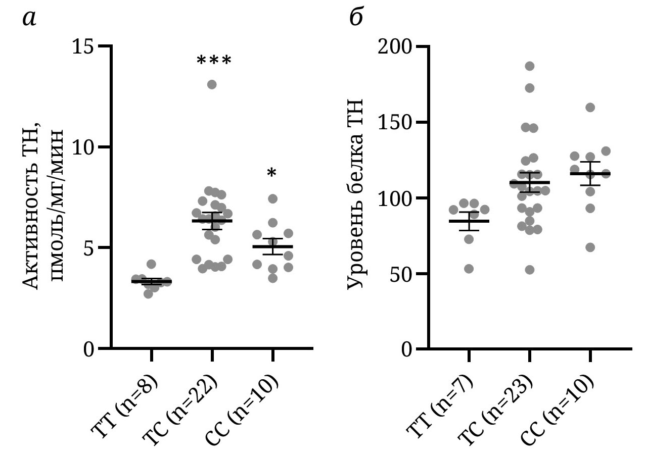 Рис. 2. Активность (а) и уровень белка (б) TH в среднем мозге интеркроссов F2 с генотипами TT, TC и CC. Данные по самцам и самкам объединены. Представлены индивидуальные значения, средние ± ошибки средних. Уровень белка TH калиброван на уровень белка GAPDH. * p < 0,05, *** p < 0,001 vs TT