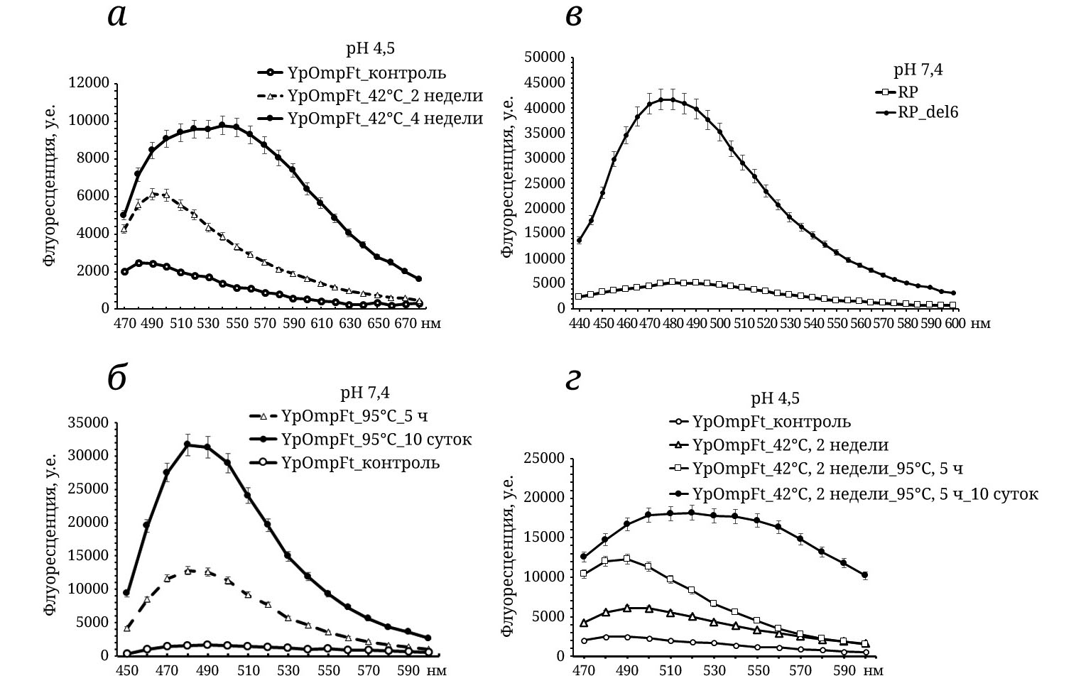 Рис. 1. Спектры флуоресценции комплекса тиофлавина Т с поринами. а – YpOmpFt после инкубации в фосфатно-цитратном буферном растворе (pH 4,5) в течение 2-х и 4-х недель при 42 °C. б – YpOmpFt после прогрева при 95 °C в течение 5 ч в Tris-HCl-буфере (pH 7,4) и последующей экспозиции при 25 °C в течение 10 суток. в – Рекомбинантные порины, полноструктурный (RP) и мутантный c делецией наружной петли 6 (RР_del6), образцы хранились в фосфатно-солевом буферном растворе (pH 7,4) в присутствии 0,01%-ного Zw 3-14 при 4 °C в течение 6 месяцев. г – YpOmpFt после инкубации в фосфатно-цитратном буферном растворе (pH 4,5) в течение 2-х недель при 42 °C, затем прогрева при 95 °C в течение 5 ч и последующей экспозиции образца при 25 °C в течение 10 суток. Флуоресценцию возбуждали при 412 нм. Данные представлены как среднее ± стандартное отклонение из трех экспериментальных повторов