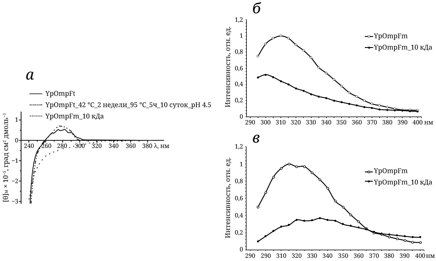 Рис. 5. Характеристика пространственной структуры различных молекулярных форм порина OmpF Y. pseudotuberculosis. а – Спектры КД в ароматической области. Спектры собственной белковой флуоресценции образцов порина YpOmpFt и YpOmpFm_10 кДа при возбуждении 280 нм (б) и 296 нм (в)