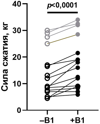 Рис. 4. Изменения силы мышц-сгибателей пальцев кистей у пациентов с ШМТ, принимающих витамин В1. Для каждого пациента показаны данные для правой и левой кистей. Закрашенные и пустые символы обозначают силу, измеренную до приема витамина и при максимальном уровне ТДФ в крови в период приема тиамина соответственно. Данные о пациентах женского пола (n = 6; пациенты 1–3, 5, 10, 13; таблица П1 в Приложении) и пациентах мужского пола (n = 2; пациенты 8, 14; таблица П1 в Приложении) показаны черными и серыми символами соответственно. Статистическую значимость определяли с помощью парного критерия Манна–Уитни