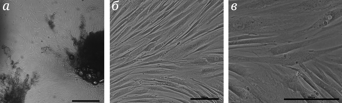 Рис. 1. Общий вид полученной линии фибробластов. а – Прижизненная микрофотография фрагмента биоптата и первичных фибробластов. Световая микроскопия. Масштаб 200 мкм. б и в – Прижизненные микрофотографии линии дермальных фибробластов на 7-м пассаже с увеличением 10× и 20× соответственно. Световая микроскопия. Масштаб 100 мкм
