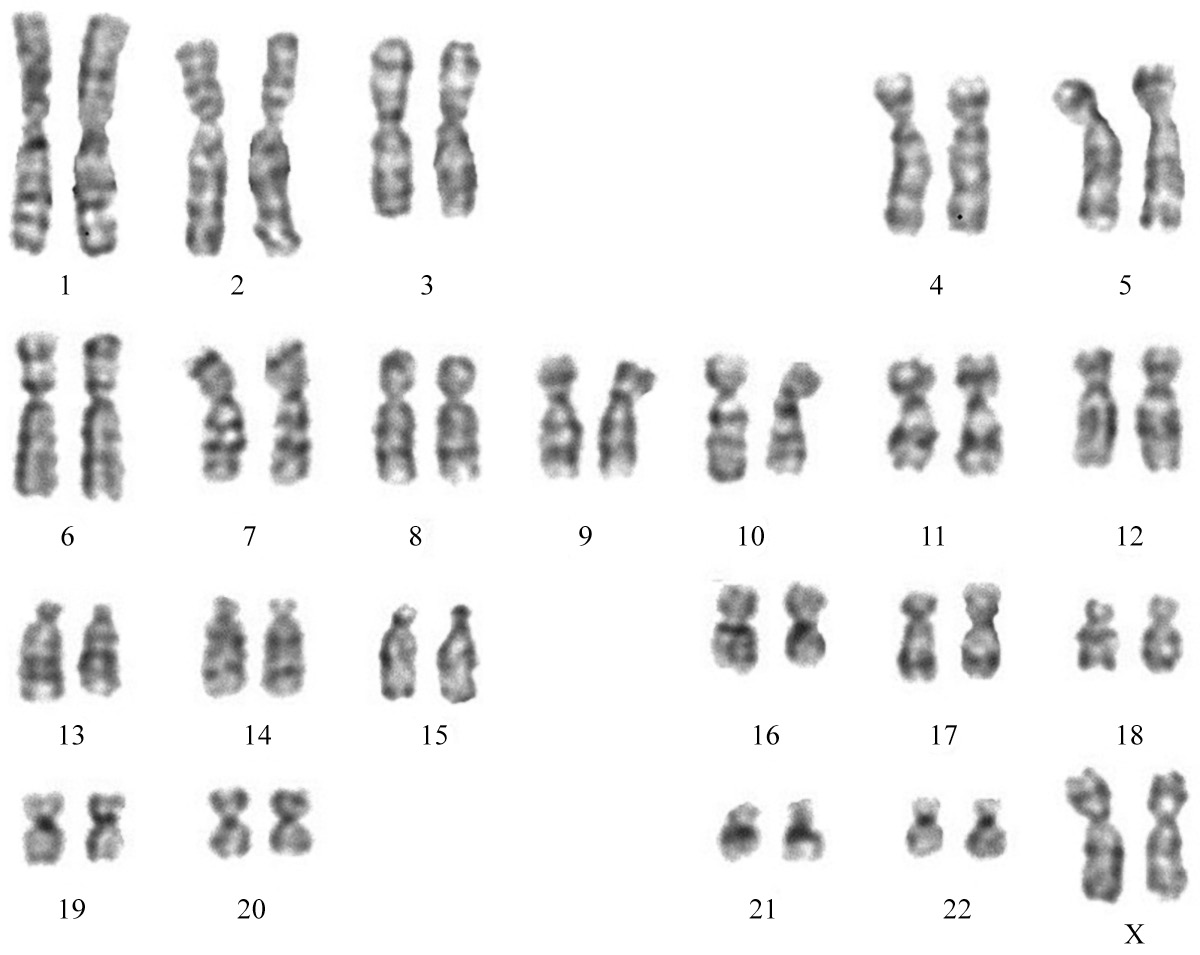 Кариотипический анализ клеточной линии HDDF проводили на 7-м пассаже. Анализ 100 метафазных пластинок показал, что клеточная линия фибробластов от больного БХ имеет нормальный кариотип – 46 ХХ. Долю полиплоидных клеток определяли, исследуя 500 метафаз, и она составила 2%. Для анализа структурных перестроек хромосом (СПХ) кариотипировали 25 метафаз. В клетках линии HDDF клональных и неклональных СПХ выявлено не было (рис. 2).