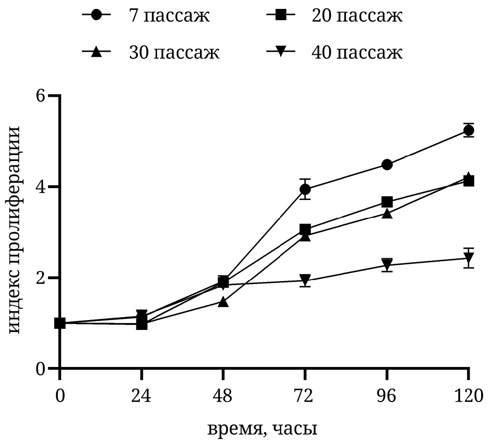 Далее была проведена оценка ростовых характеристик полученной клеточной линии в процессе длительного культивирования на 7-м, 20-м, 30-м и 40-м пассажах. На основании данных проточной цитометрии были вычислены ИП клеток для разных суток культивирования и построены кривые роста культуры. На графике чётко видна тенденция постепенного снижения ИП клеточной культуры в процессе длительного культивирования и, как следствие, увеличение времени одного удвоения клеточной популяции в фазе её логарифмического роста. На 70-м пассаже время одного удвоения клеточной популяции составило 24 ч, на 20-м пассаже – 32 ч, на 30-м пассаже – 45 ч, на 40-м пассаже – 55 ч.
