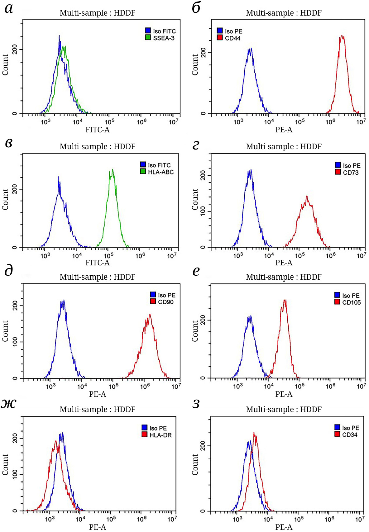 Рис. 5. Фенотипирование клеток линии HDDF при помощи проточной цитофлуориметрии (а–з)