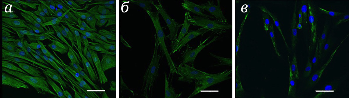Рис. 6. Иммунофлуоресцентное окрашивание клеток на маркеры фибробластов. а – Окрашивание антителами к виментину. б – Окрашивание антителами к α-актинину. в – Окрашивание антителами к нестину. Визуализация ядер осуществлялась красителем DAPI. Конфокальная микроскопия, ×40. Масштаб 50 мкм