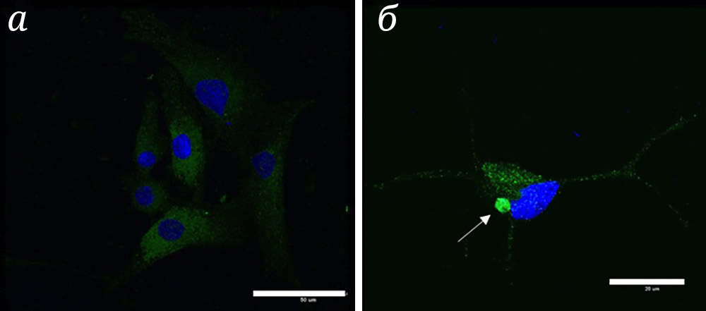 Рис. 8. Визуализация mHTT в фибробластах и индуцированных нейронах линии HDDF. а – Иммунофлуоресцентное окрашивание фибробластов антителами к mHTT (клон мEM48). Конфокальная микроскопия, ×60. Масштаб 50 мкм. б – Иммунофлуоресцентное окрашивание индуцированных нейронов стриатума, полученных из фибробластов линии HDDF, антителами mEM48 (вторичные антитела, конъюгированные с флуорофором Alexa 488), и окрашивание ядер красителем DAPI. Конфокальная микроскопия, ×60. Масштаб 20 мкм